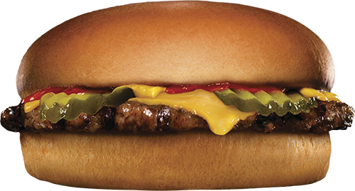 Hamburguesa con carne 100% de res asada a la parrilla , mostaza, catsup, queso estilo americano y pepinillos.