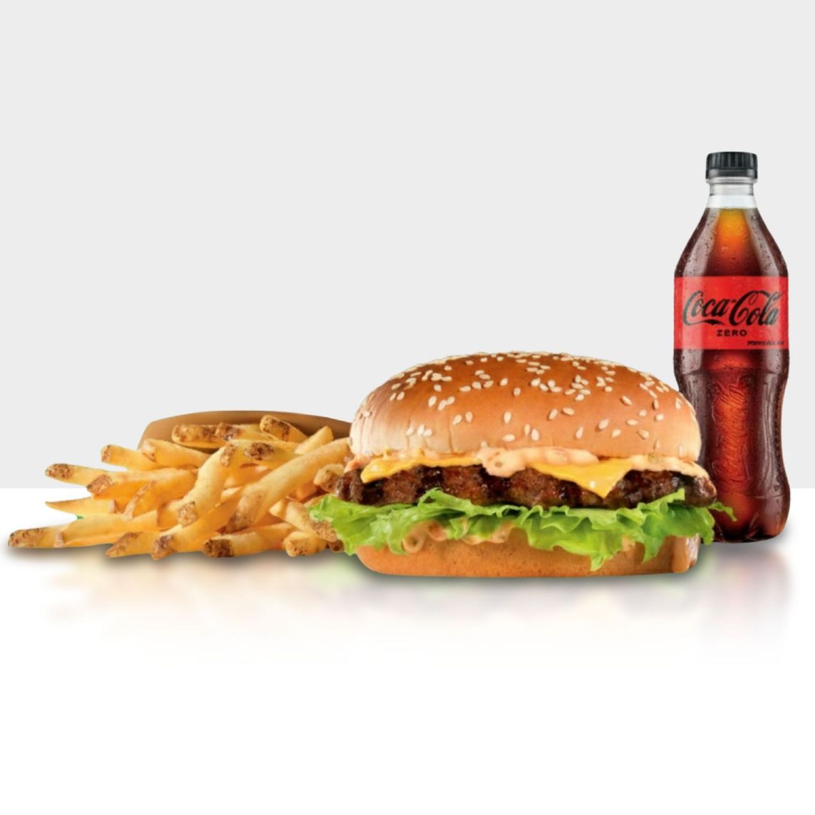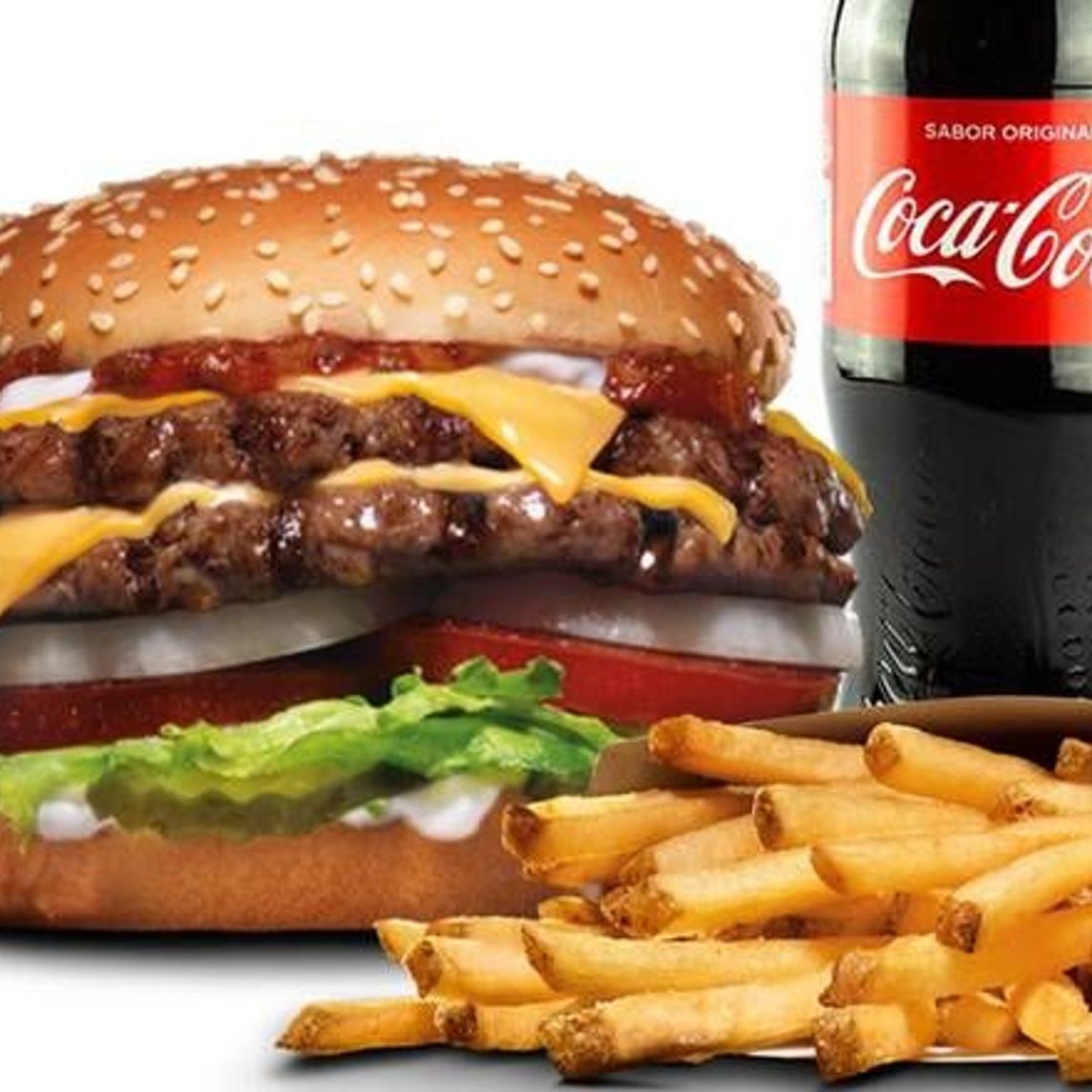 Con Carne 100% de res, queso Americano, lechuga, tomate, cebolla blanca y aderezo All-American. Servida en pan con ajonjolí. El combo incluye papas chicas (105 gr) y refresco (600 ml)