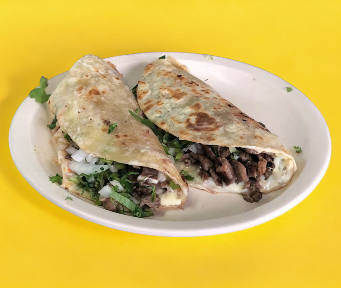 Tortilla de harina, queso y carne asada, acompañado de cebolla con cilantro y cebolla marinada, limones y salsa.