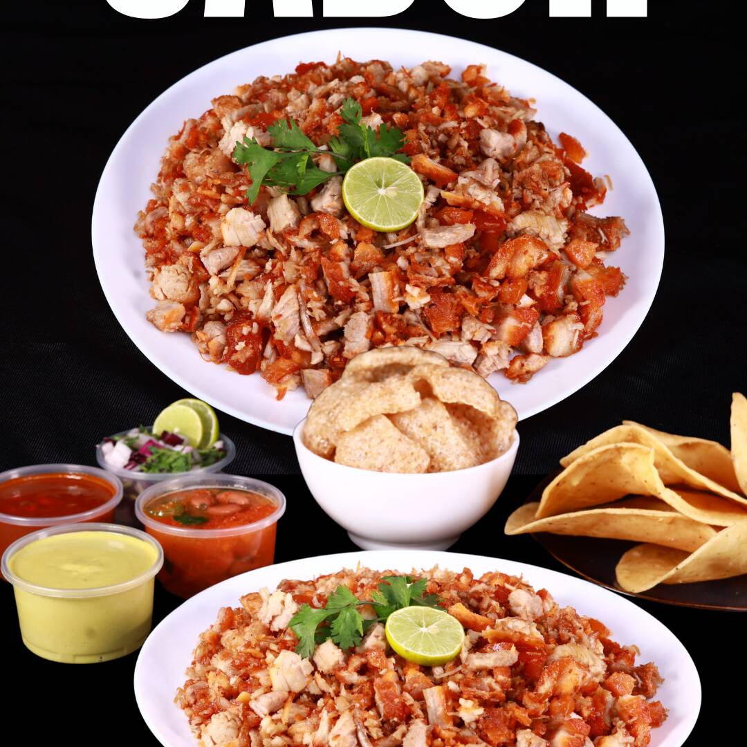 1 Kilo de surtido, salsa roja y verde, verdura, tortillas, medio litro de frijoles charros, charola de chicharrón y un paquete de tostadas de la casa.