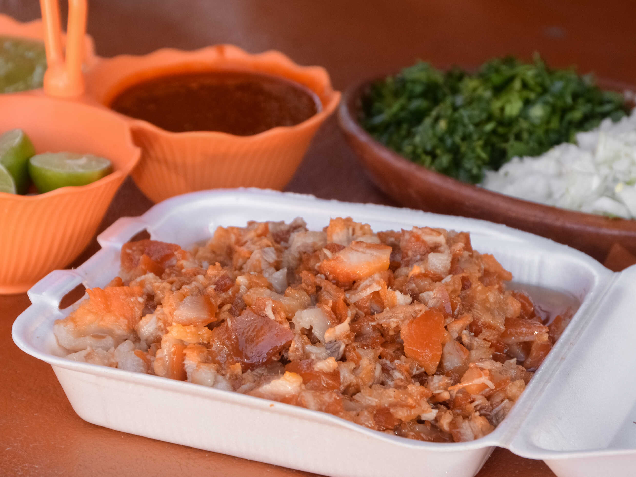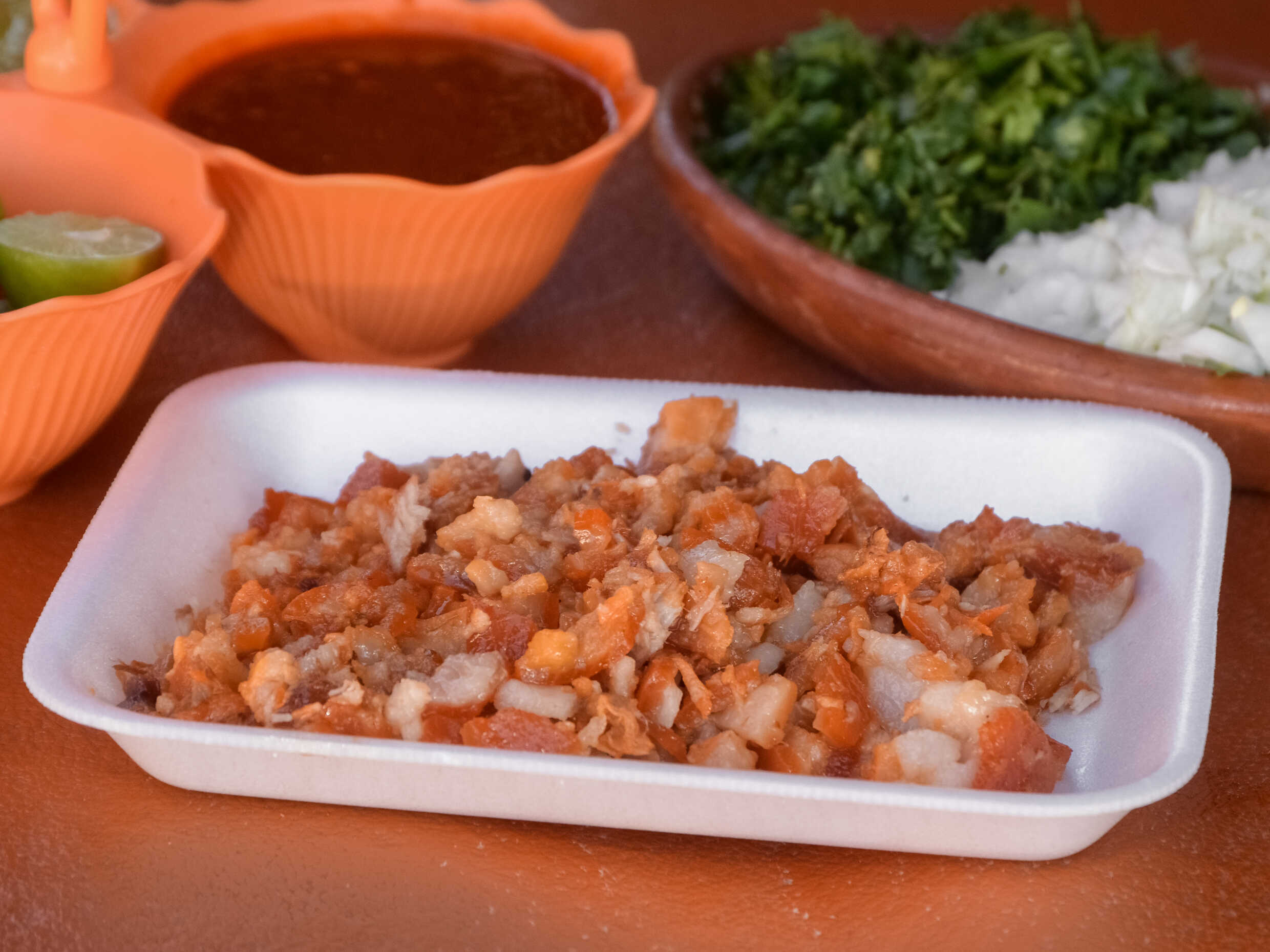 1 kilo de carne y cuero, tortillas, salsa y verdura.
