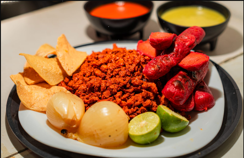 1 kg adobada (receta secreta de la casa), 6 mitades de salchicha, cebolla asada picada, tortillas de harina y maíz, salsa verde, salsa naranja, totopos y limones.