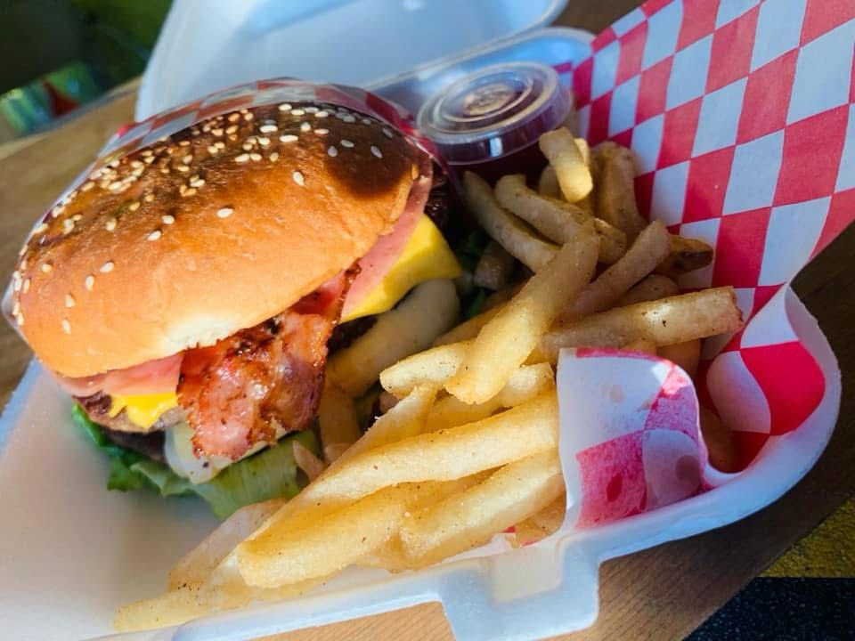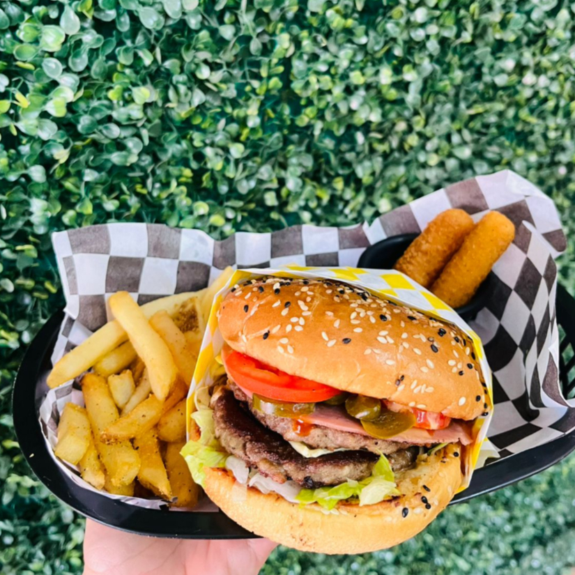 Hamburguesa de carne de res con jamón, queso y tocino. Incluye papas a la francesa.