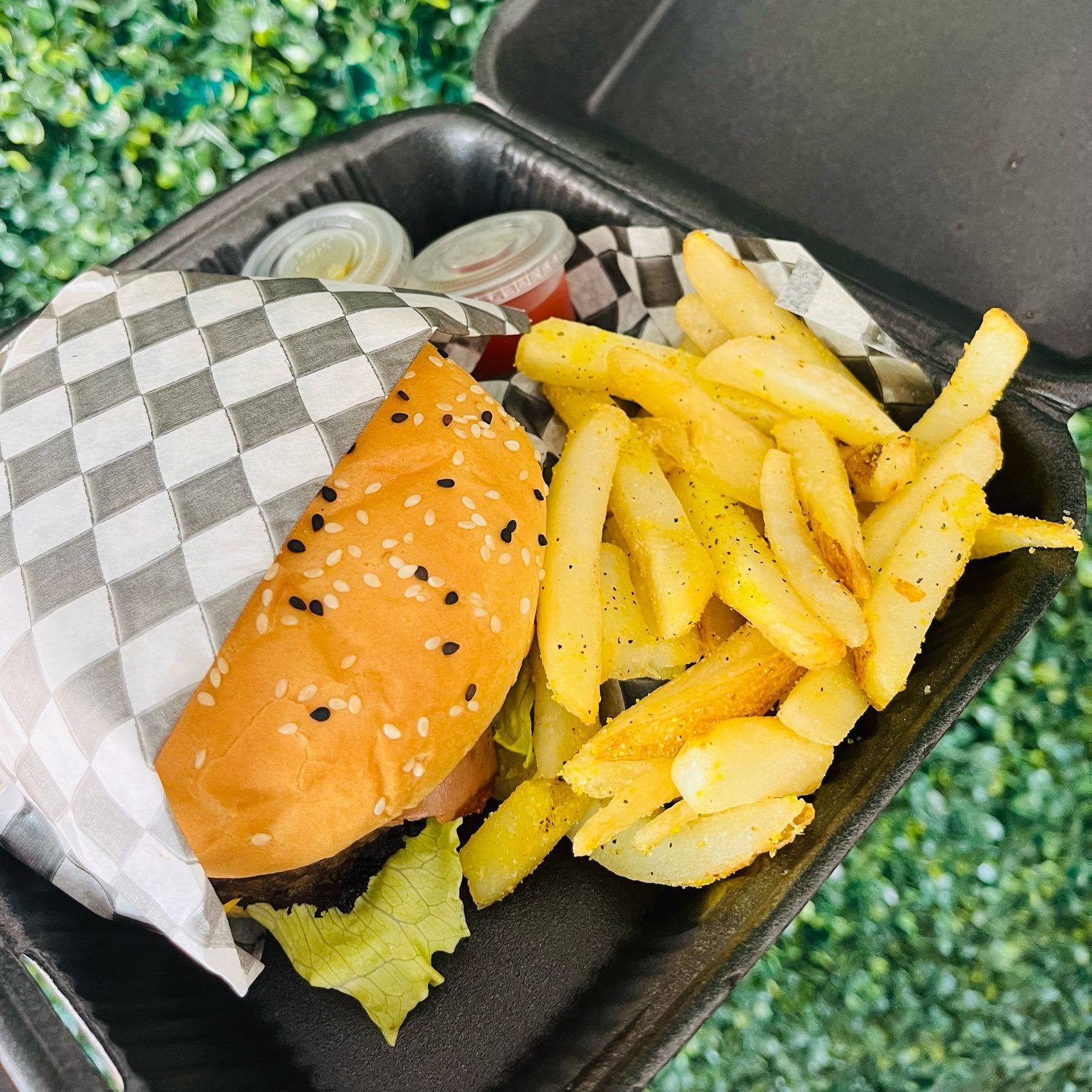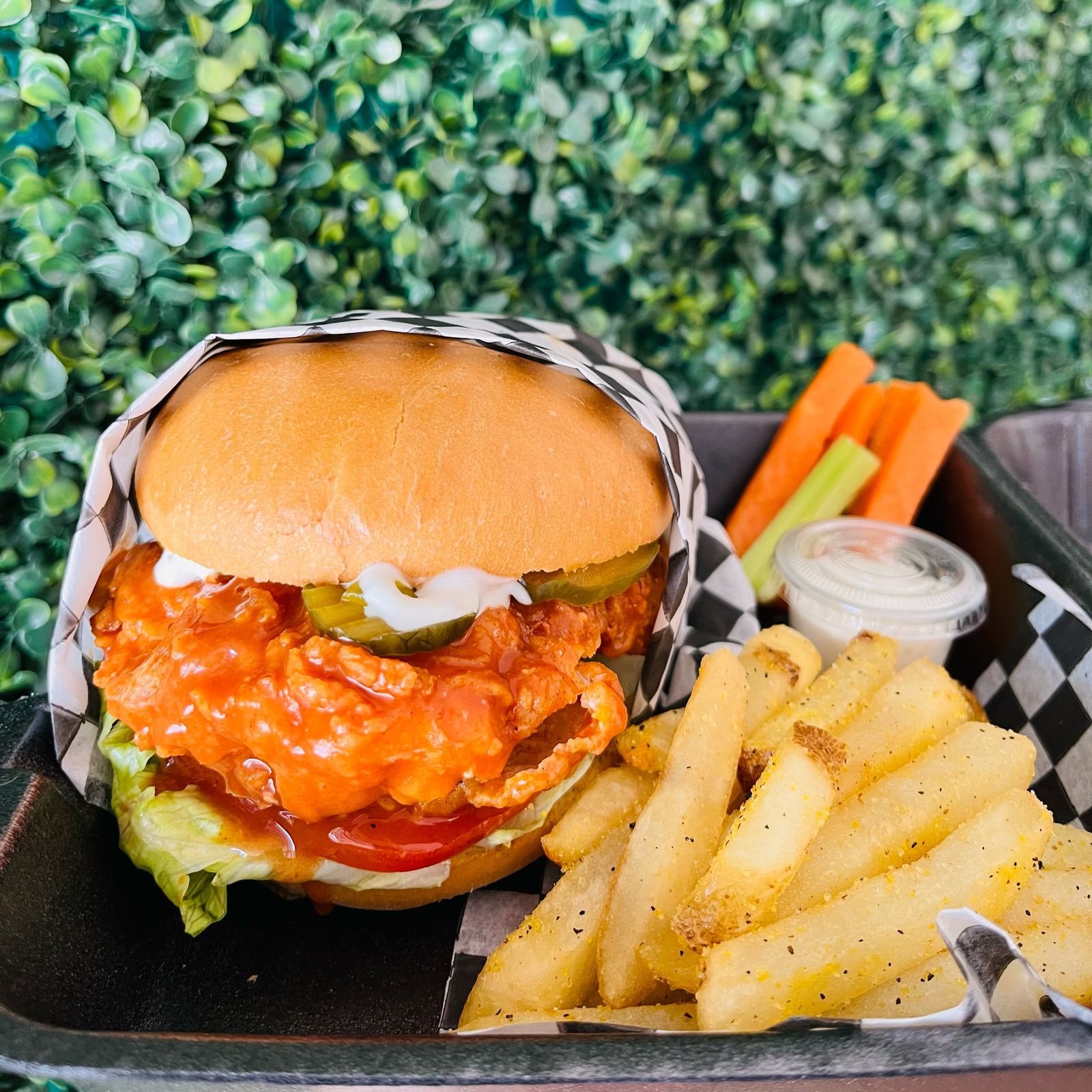 Hamburguesa de pollo crujiente con salsa a elección y papas a la francesa.