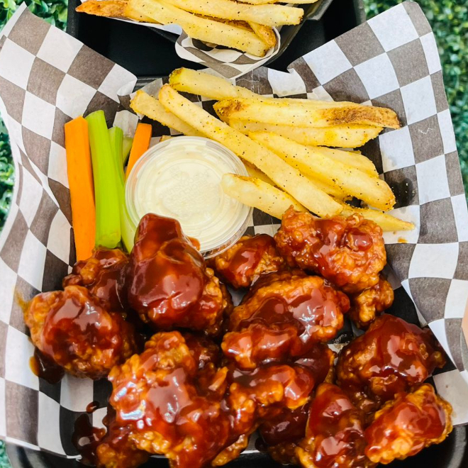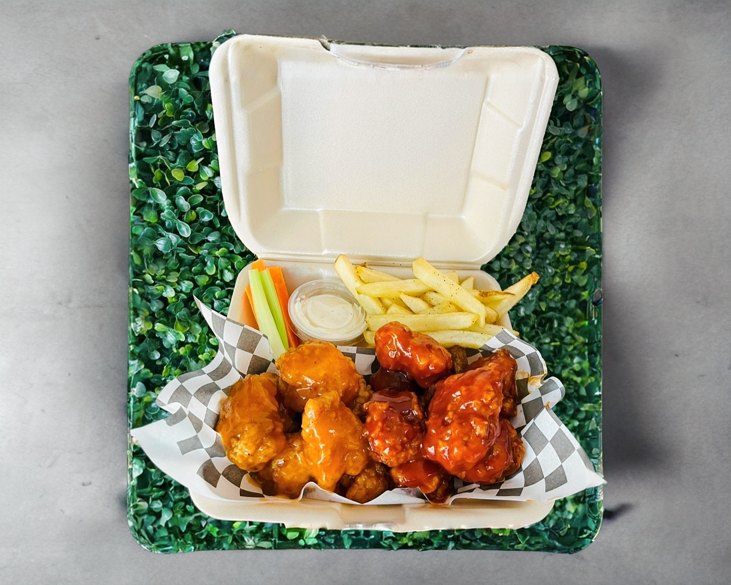 Trozos de pollo empanizados bañados en las salsas de tu elección. Incluye un aderezo ranch, guarnición de papas a la francesa y vegetales