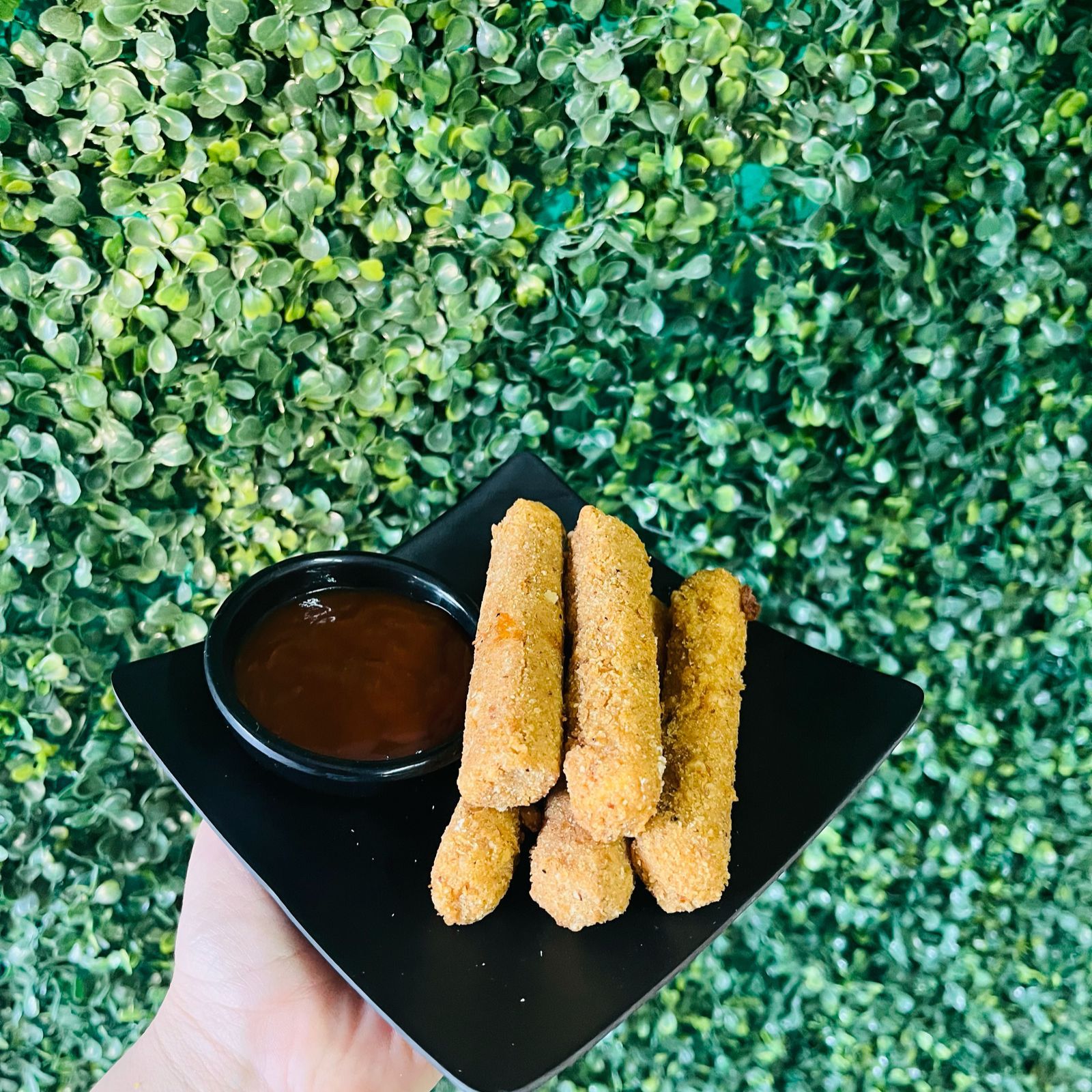 5 dedos de queso empanizados. Incluye aderezo BBQ.