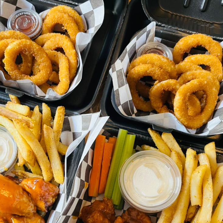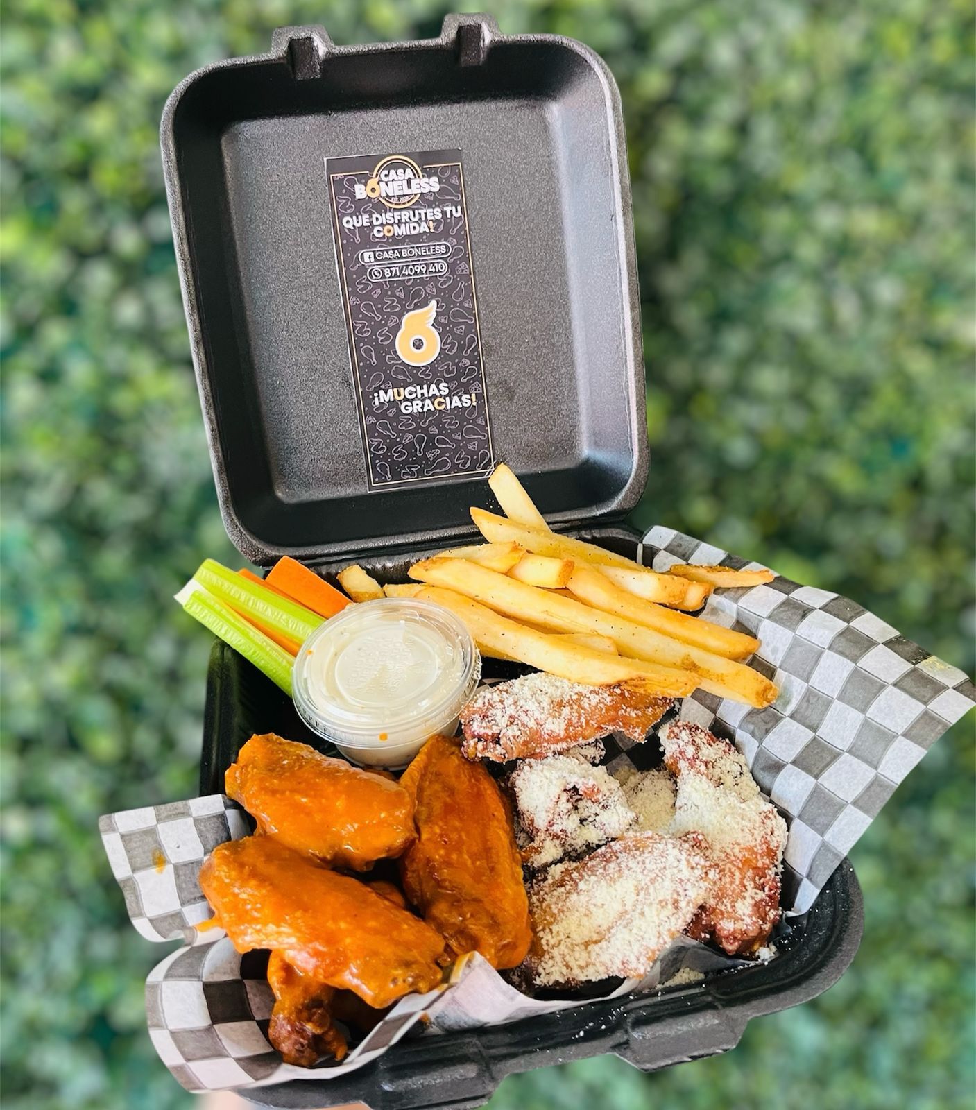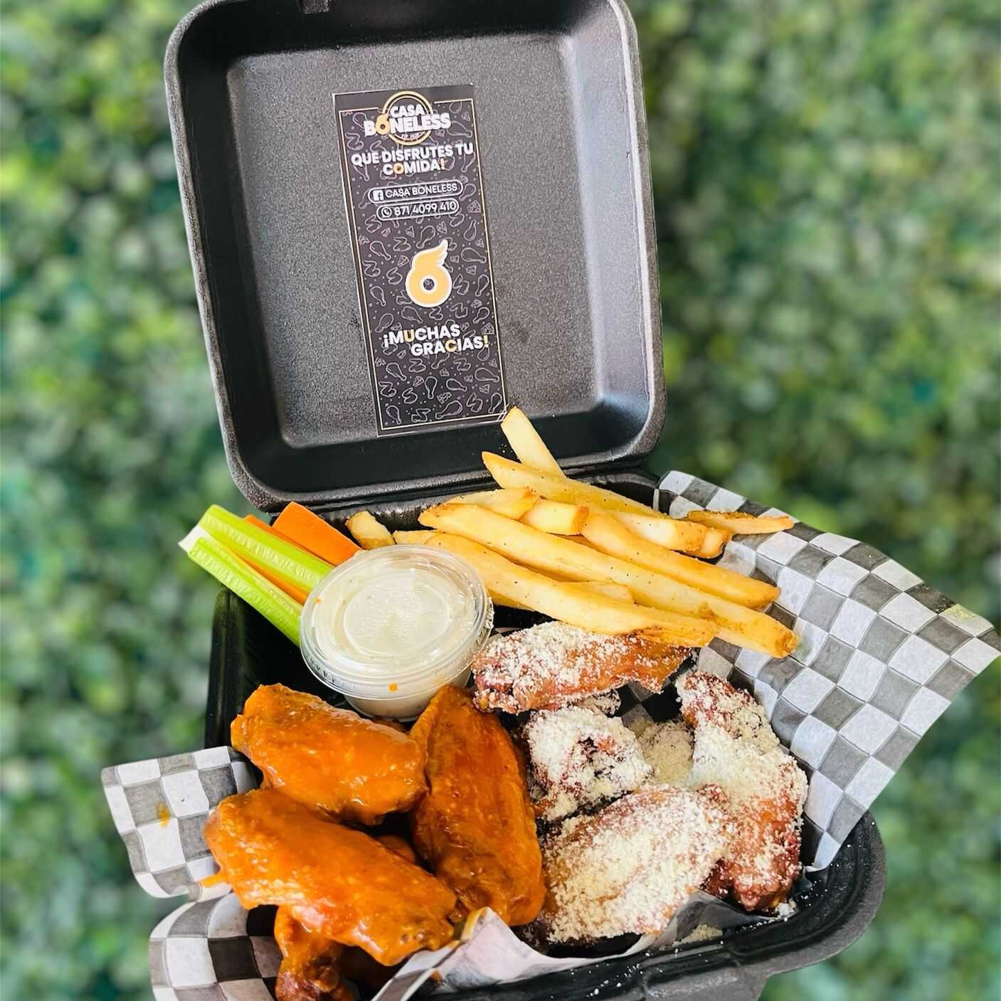Alitas de pollo bañadas en tus salsas favoritas. Incluye un aderezo ranch, guarnición de papas a la francesa y vegetales