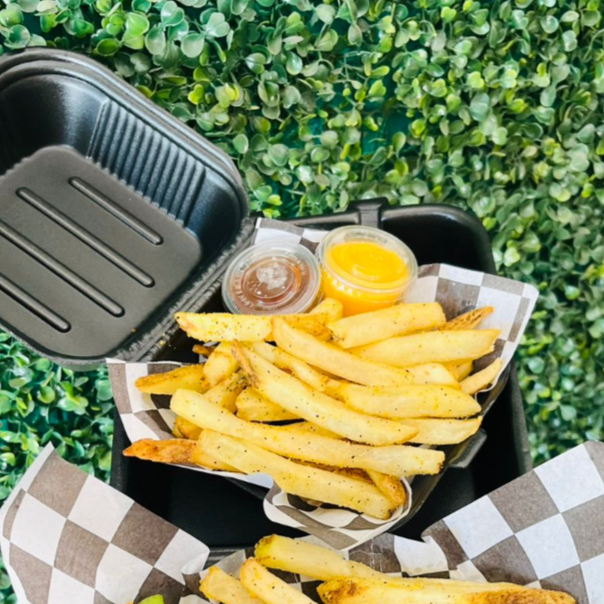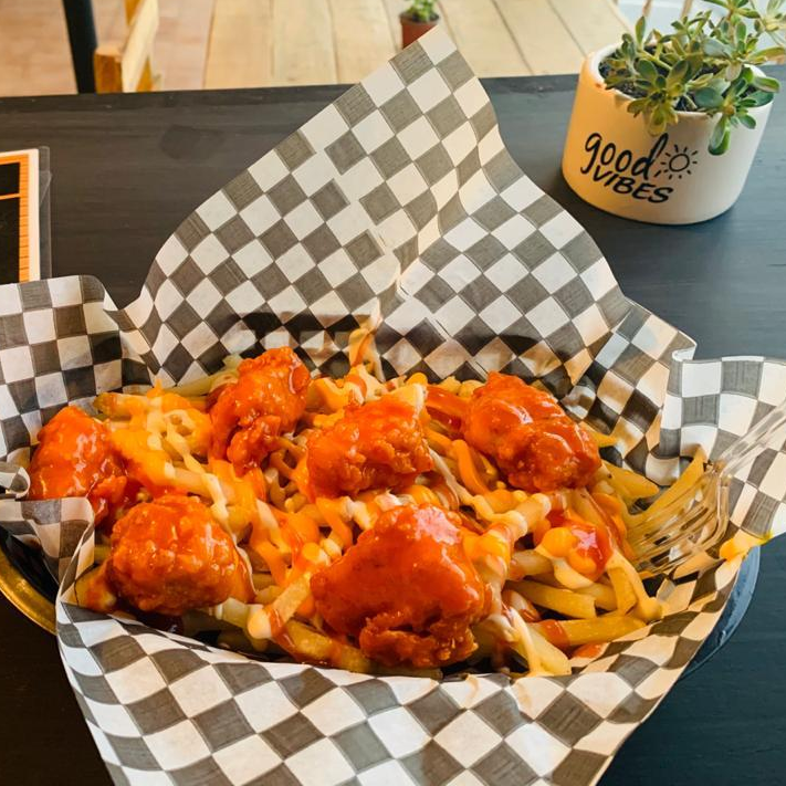Papas a la francesa con aderezo ranch, queso amarillo y boneless en salsa a elección