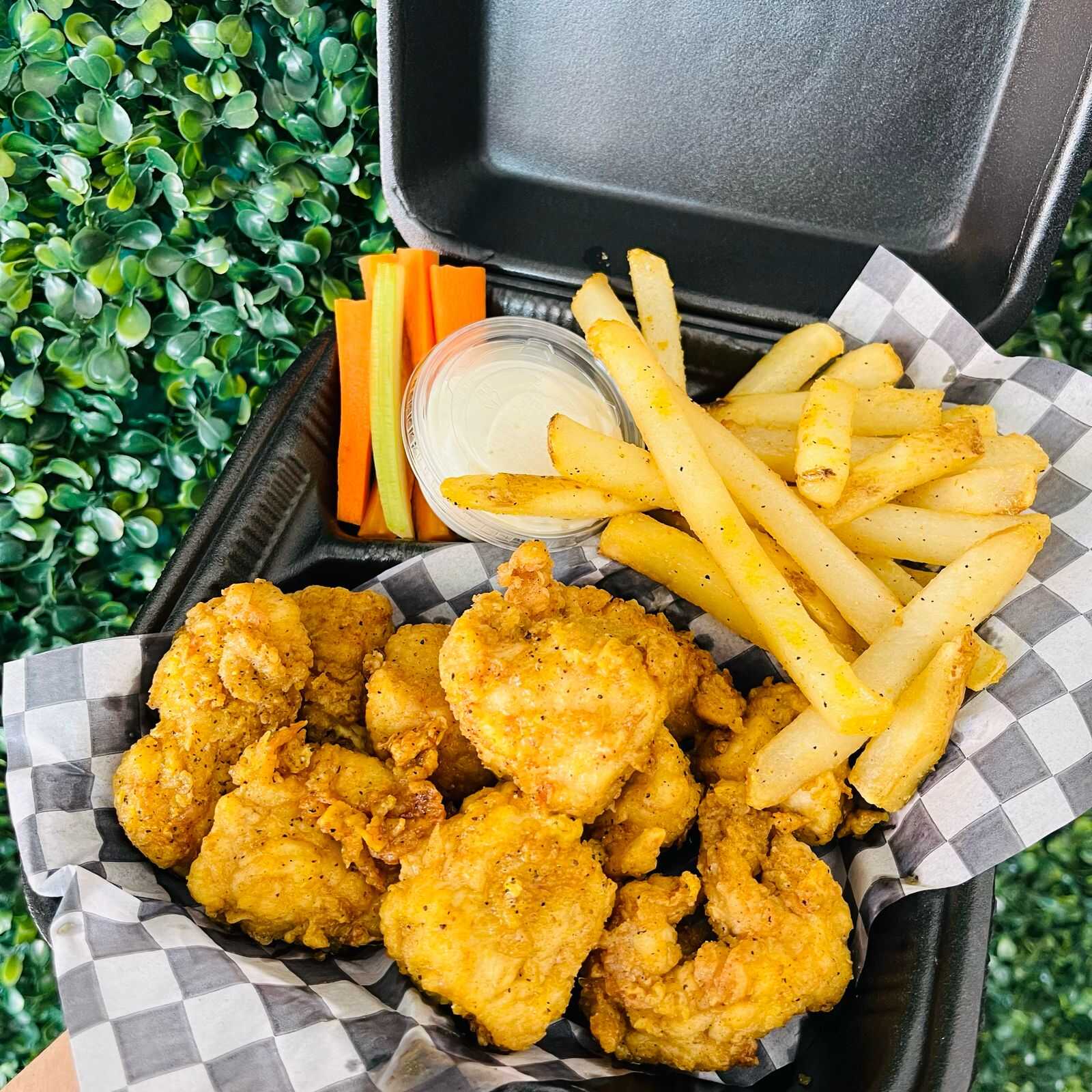 Trozos de pollo empanizados bañados en las salsas de tu elección. Incluye un aderezo ranch, uno a elección, guarnición de papas a la francesa y vegetales