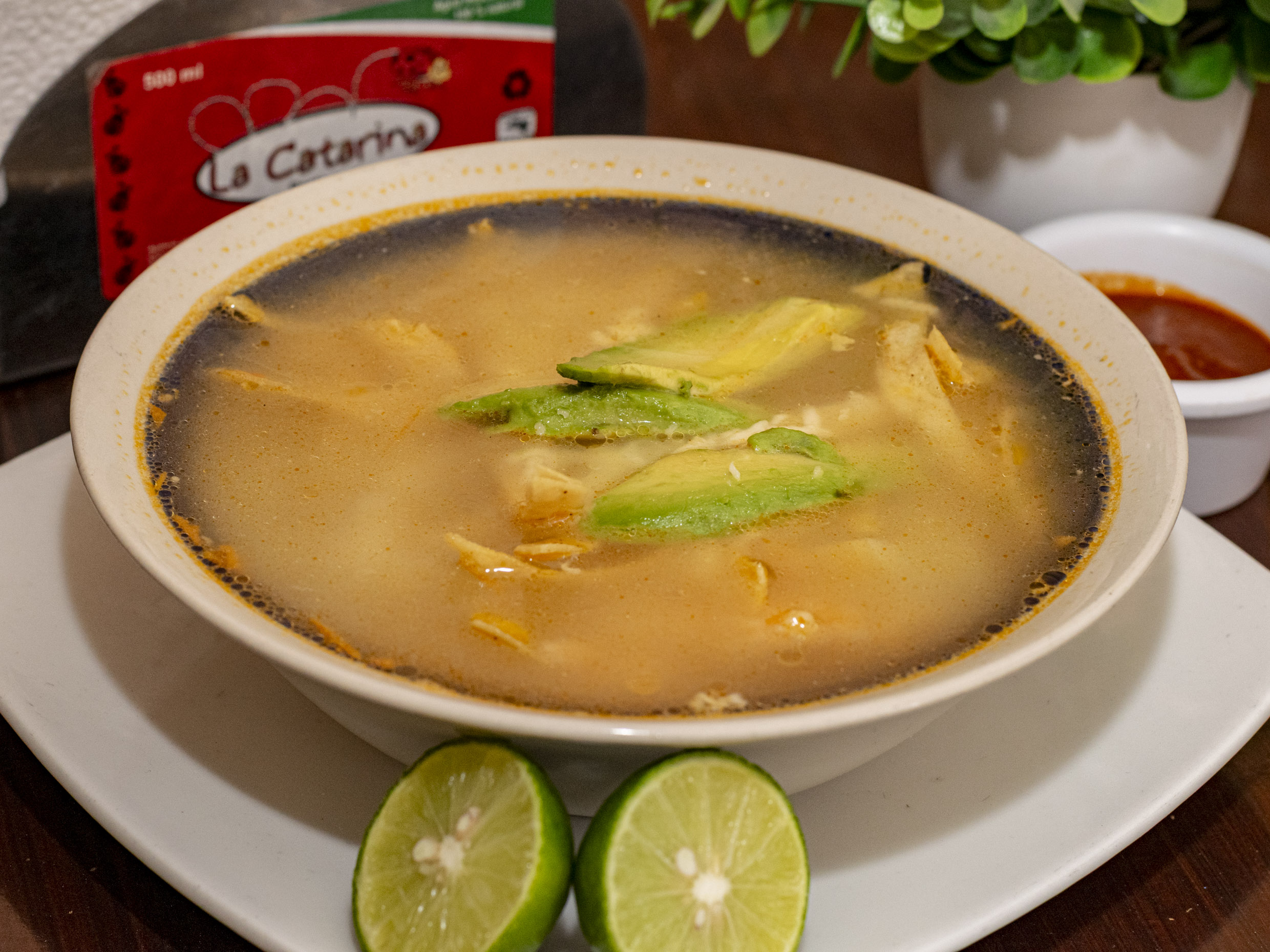 Caldo de pollo con tortilla garbanzo queso chipotle arroz aguacate