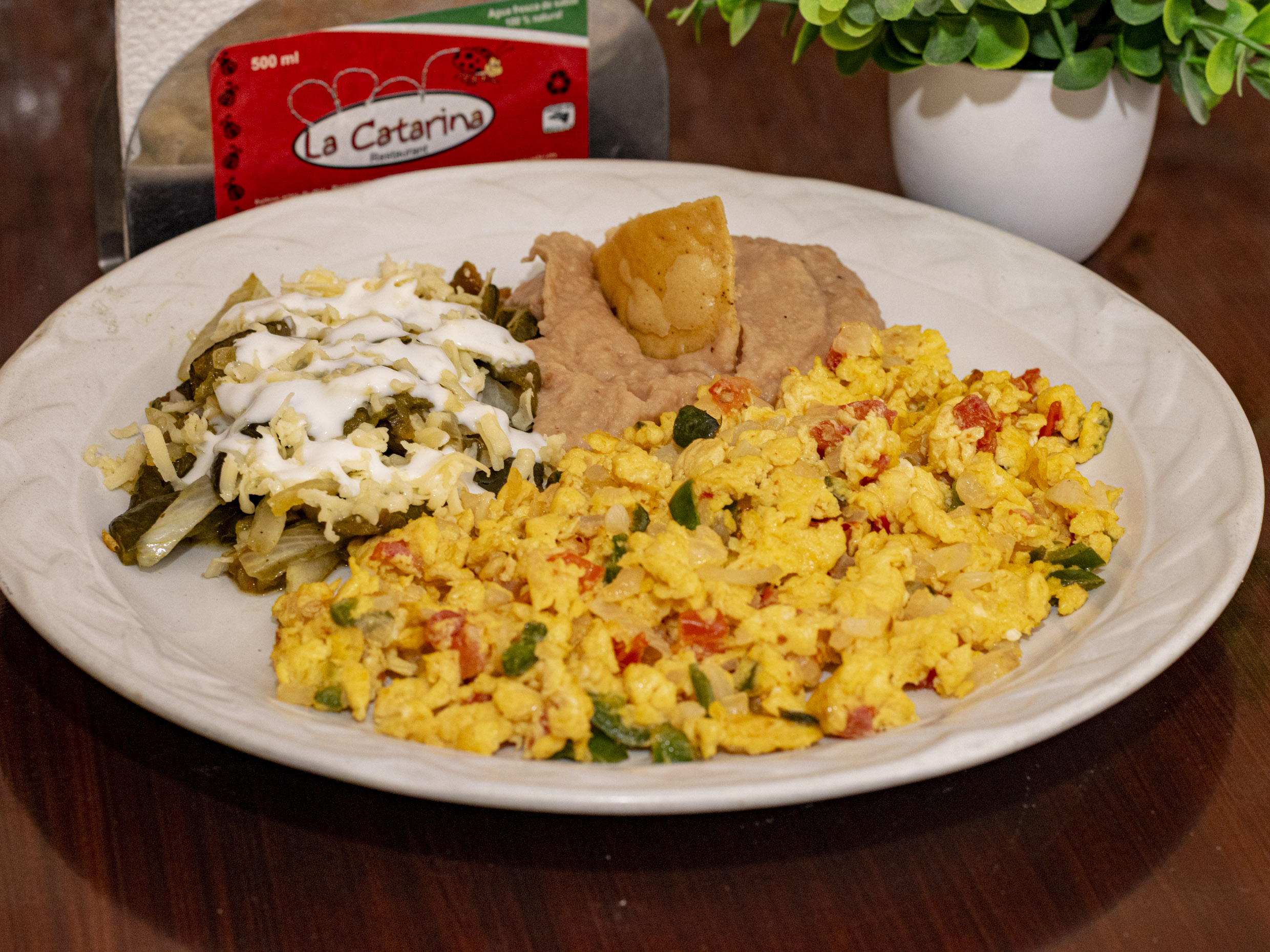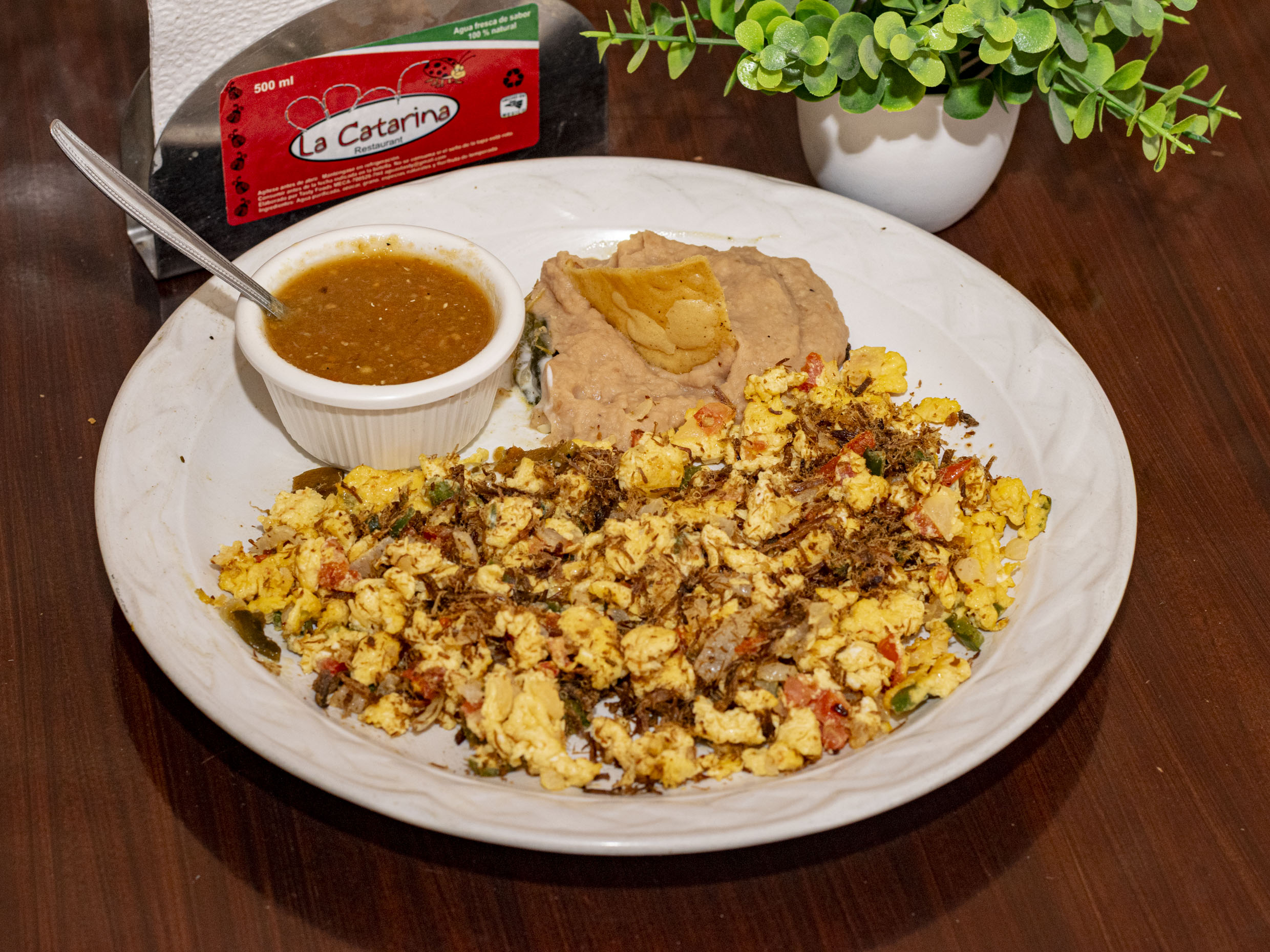 Huevos revueltos con machaca bañados en salsa acompañados de frijoles