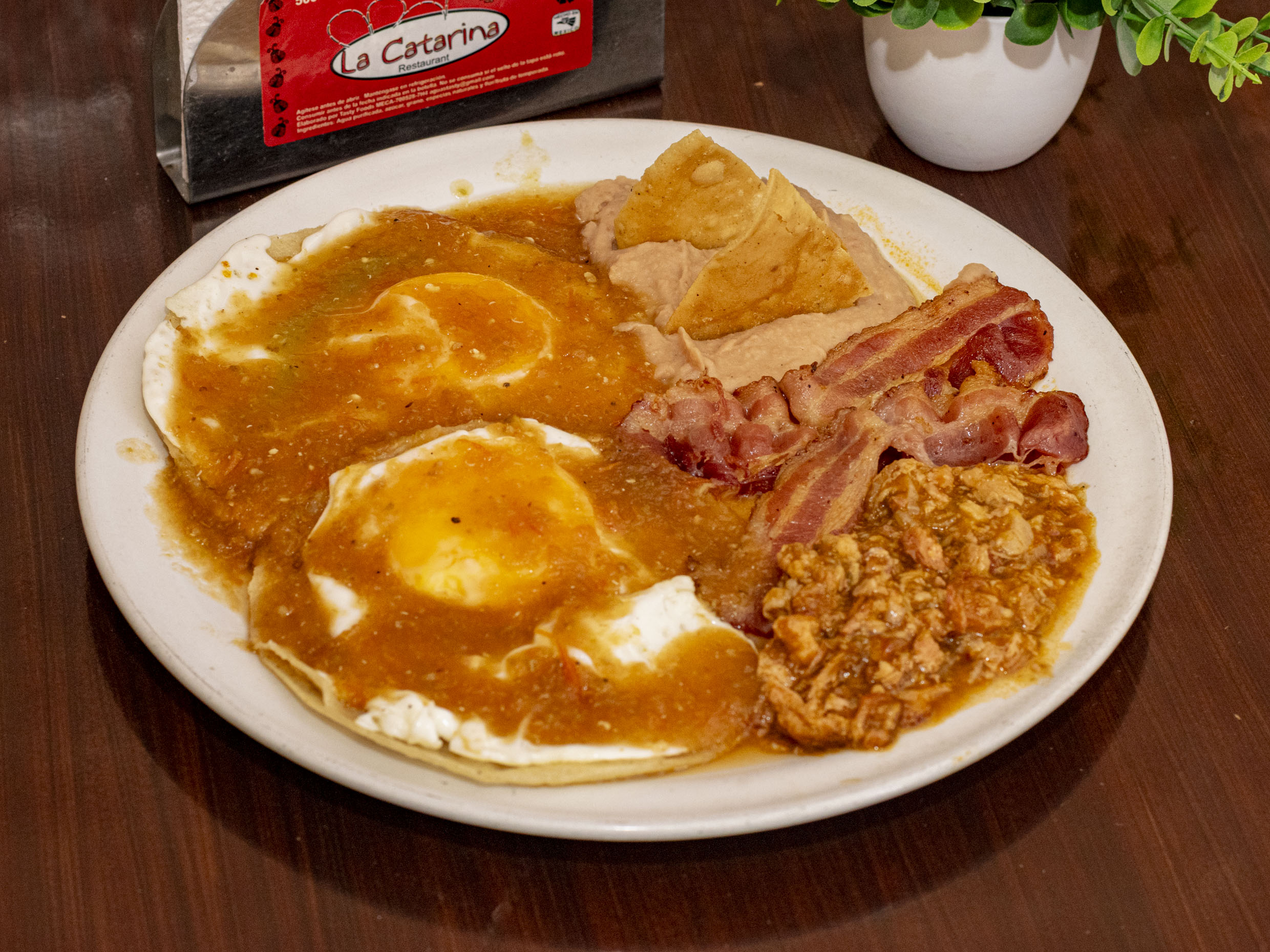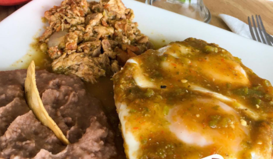 Estrellados sobre tortilla frita bañados en salsa ranchera acompañado de frijoles y un guiso