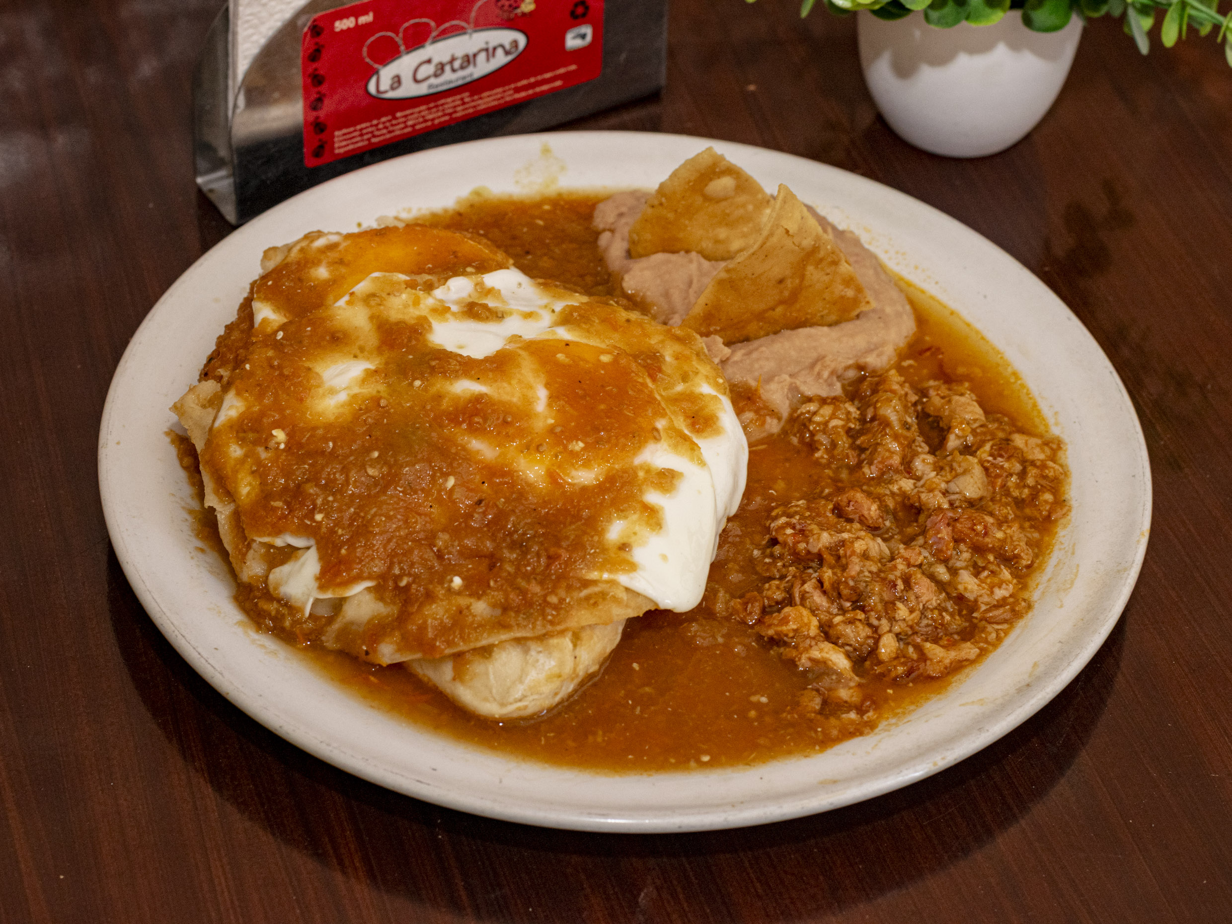 Chilaquiles motados con estrellados acompañados de frijoles
