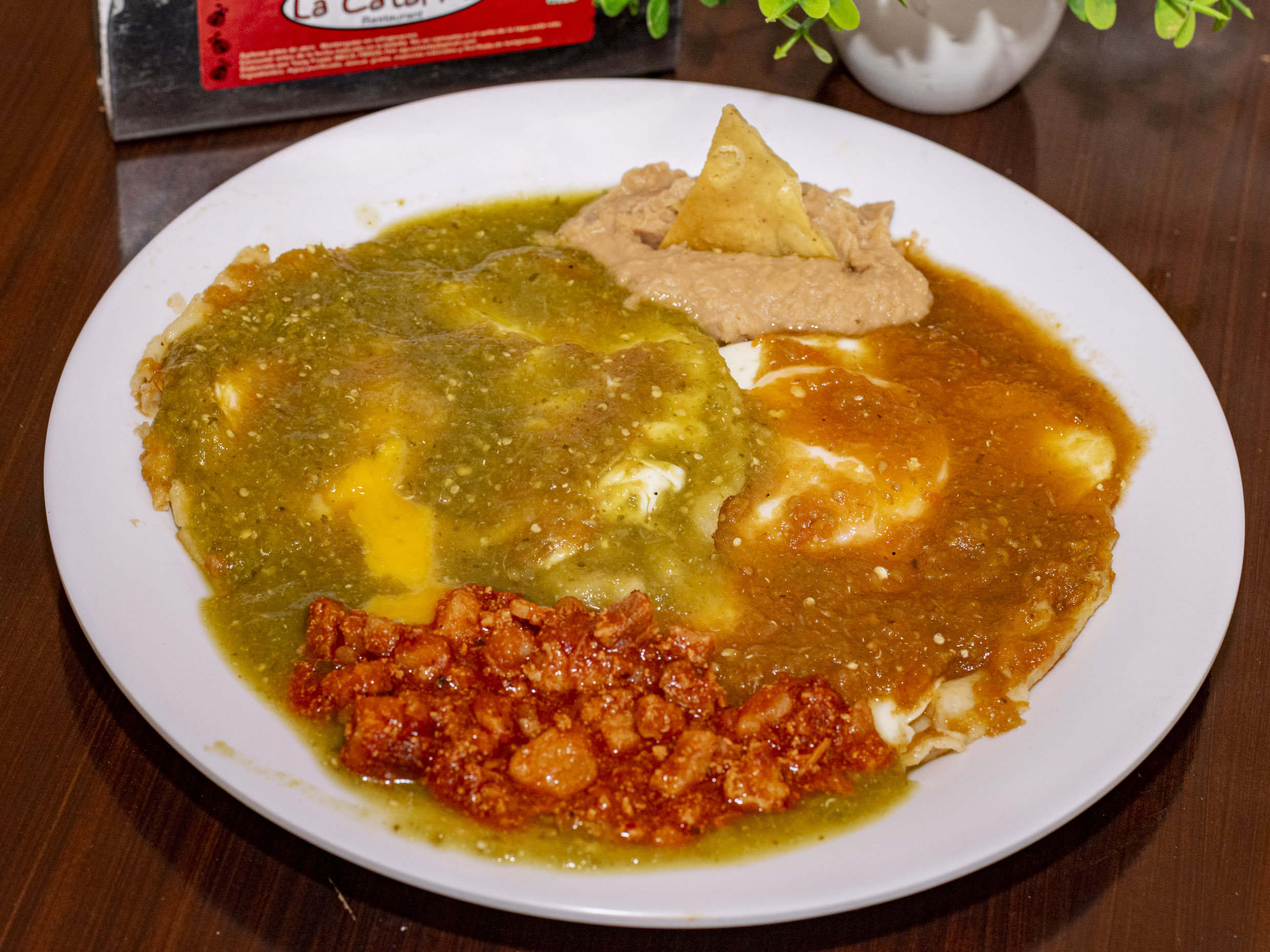 Estrellados sobre tortilla frita bañados en 2 salsas acompañados de frijoles y un guiso