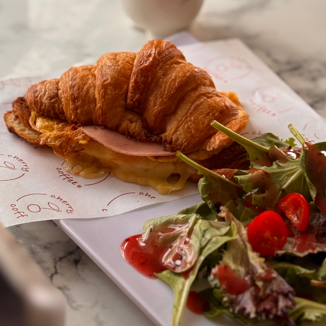 Nuestro croissant recién hecho, relleno de queso manchego y jamón de pavo.