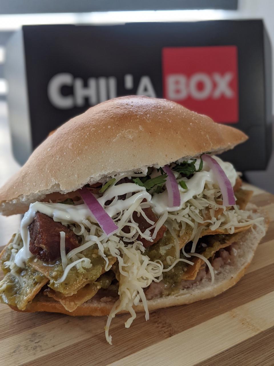 Deliciosa torta con bolillo, chilaquiles, cualquiera de nuestras salsas y proteínas y toppings a elegir.