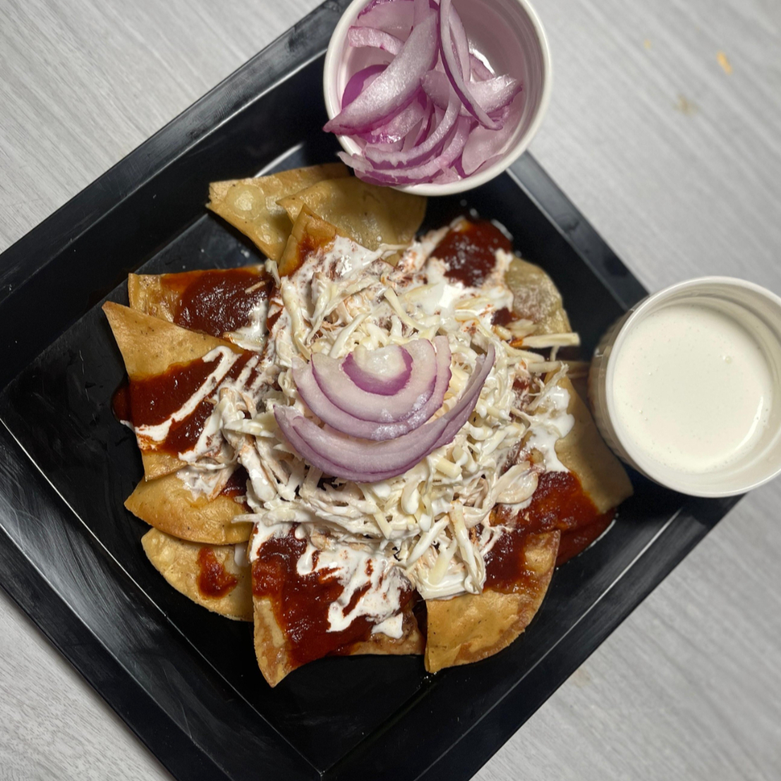 Totopo dorado, bañados en salsa roja, acompañados de queso, frijoles, crema y cebolla morada.