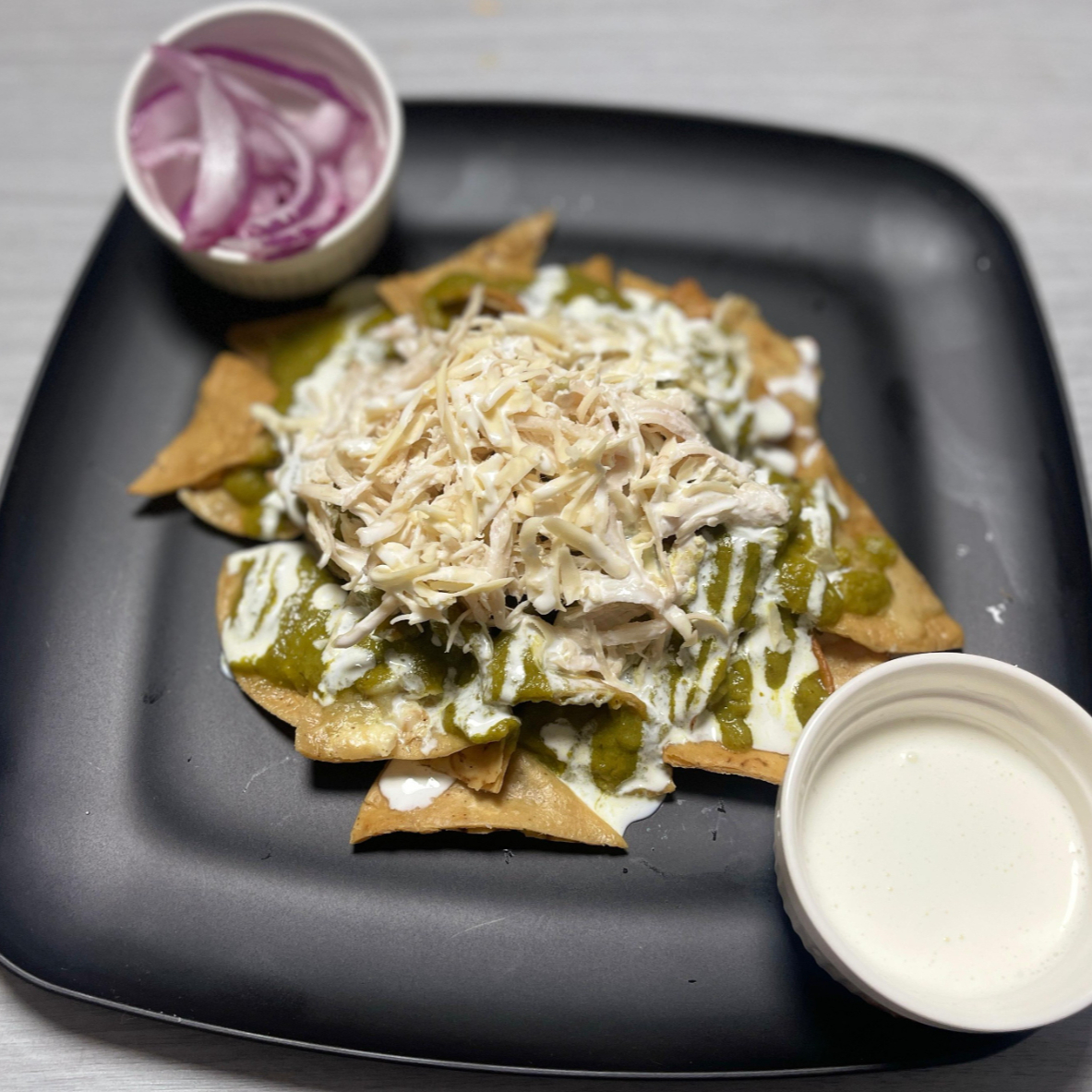 Totopo dorado, bañados en salsa verde, acompañados con frijoles, pollo, crema y cebolla morada.