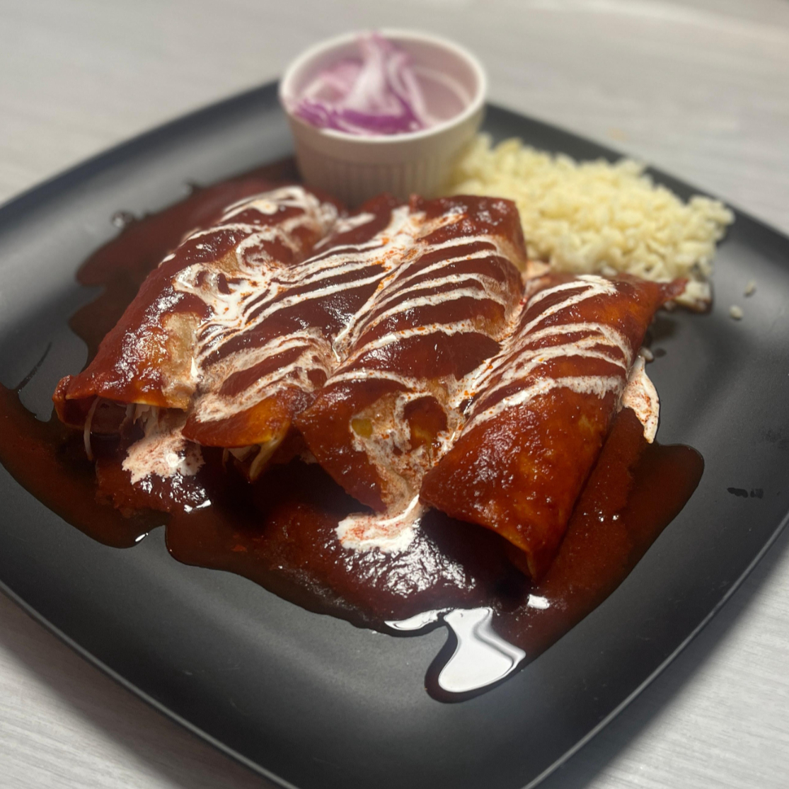 4 Tortillas de maiz rellenas de pollo, bañadas en salsa roja (chiles secos tradicional), acompañadas de espagueti, con crema, queso y cebolla morada.
