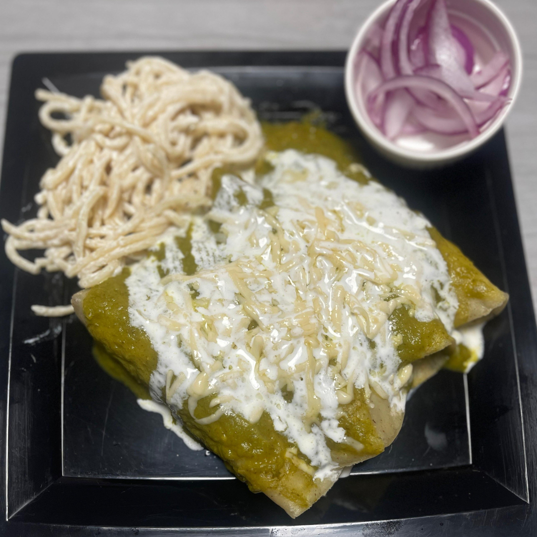 4 Tortillas de maiz rellenas de pollo, bañadas en salsa verde (cremosa con tomatillo un toque de serrano, queso crema y cilantro), acompañadas con espagueti, crema, queso y cebolla morada.