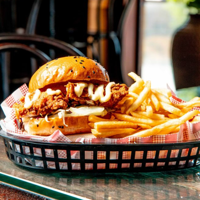 Deliciosas hamburguesa con crujiente pechuga de pollo, tocino y cheddar con papas fritas.