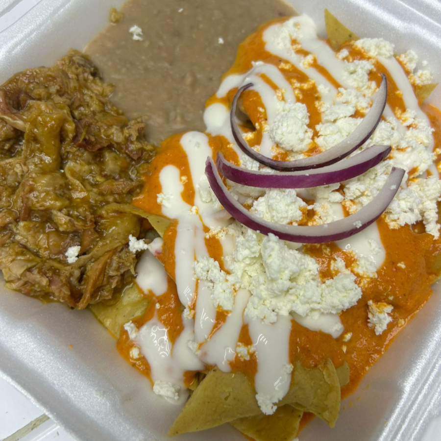 chilaquiles rojos con prensado, crema, queso panela, cebolla acompañado de frijoles .
