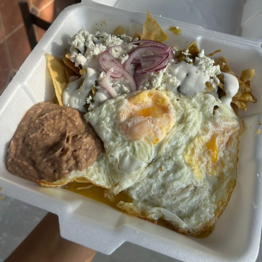 deliciosos chilaquiles verdes, con crema, queso panela, cebolla acompañados de frijoles