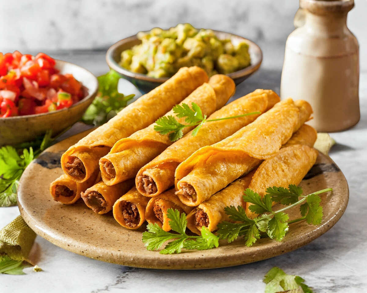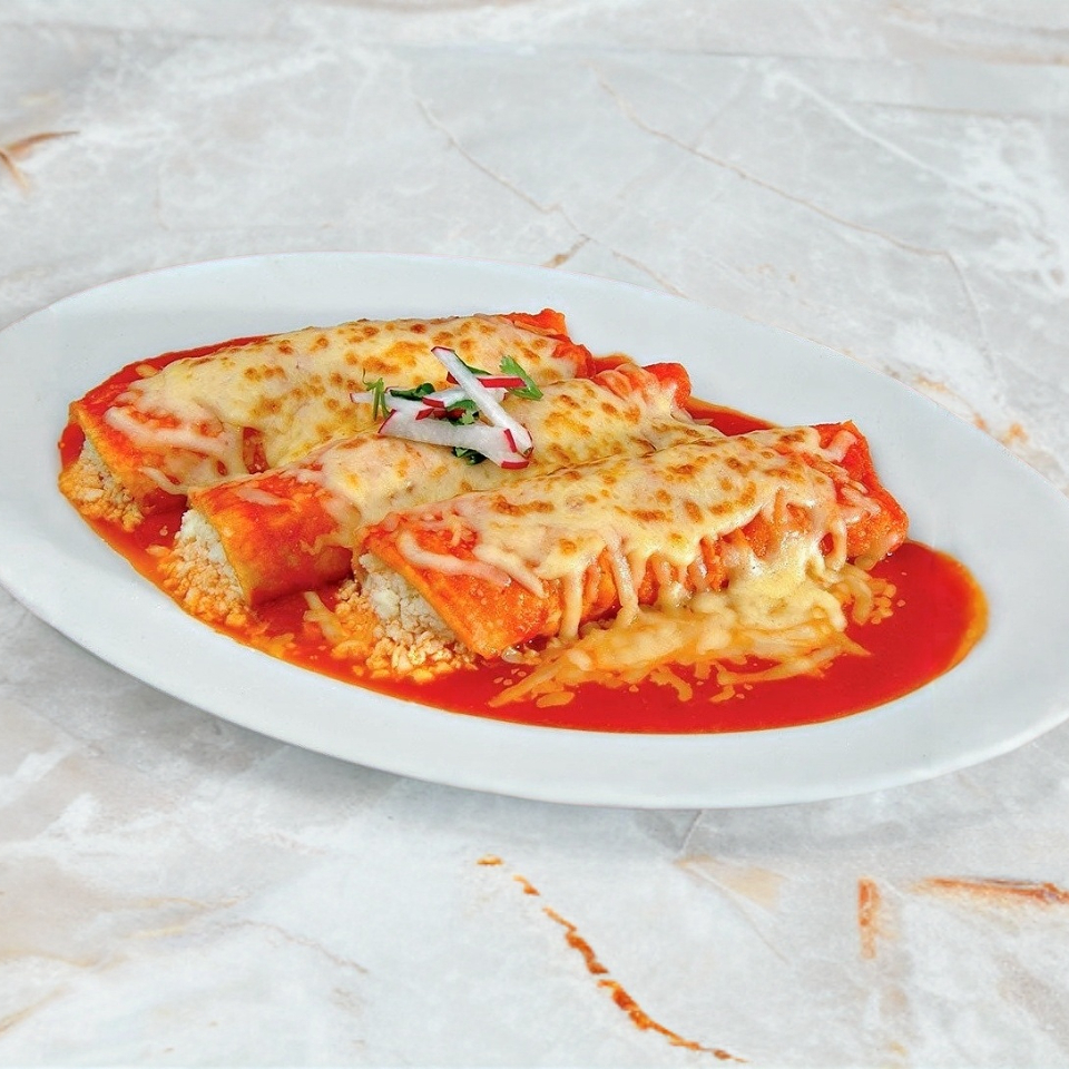 Orden de 3 entomatadas rellenas de pollo o queso, acompañado de dos guarniciones.