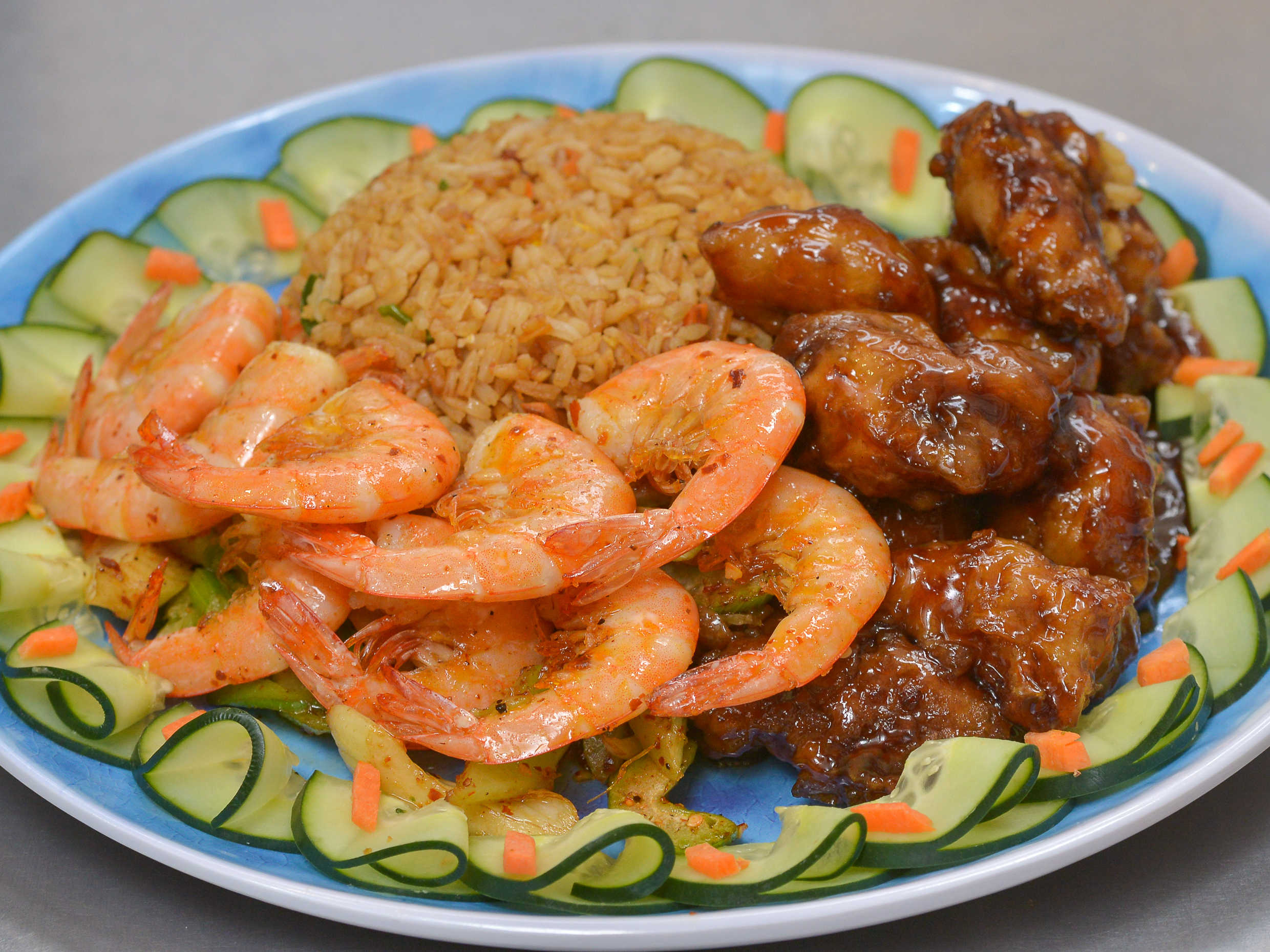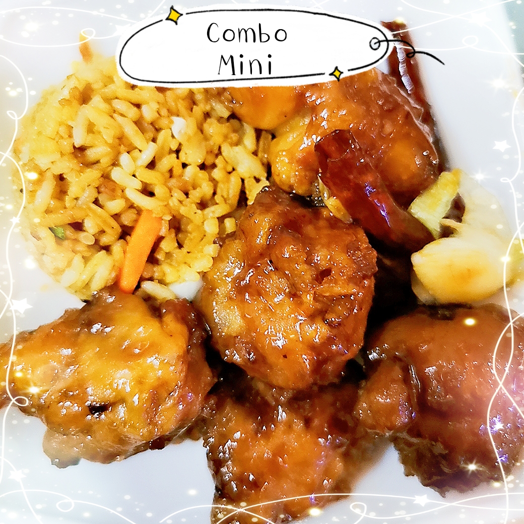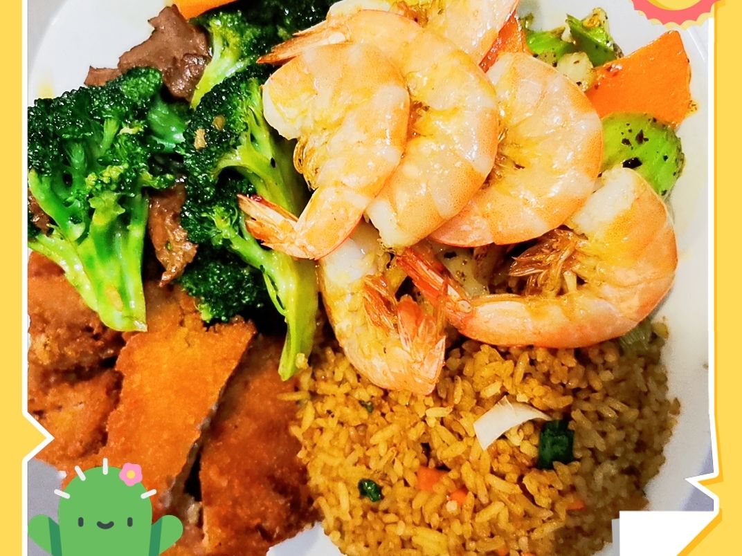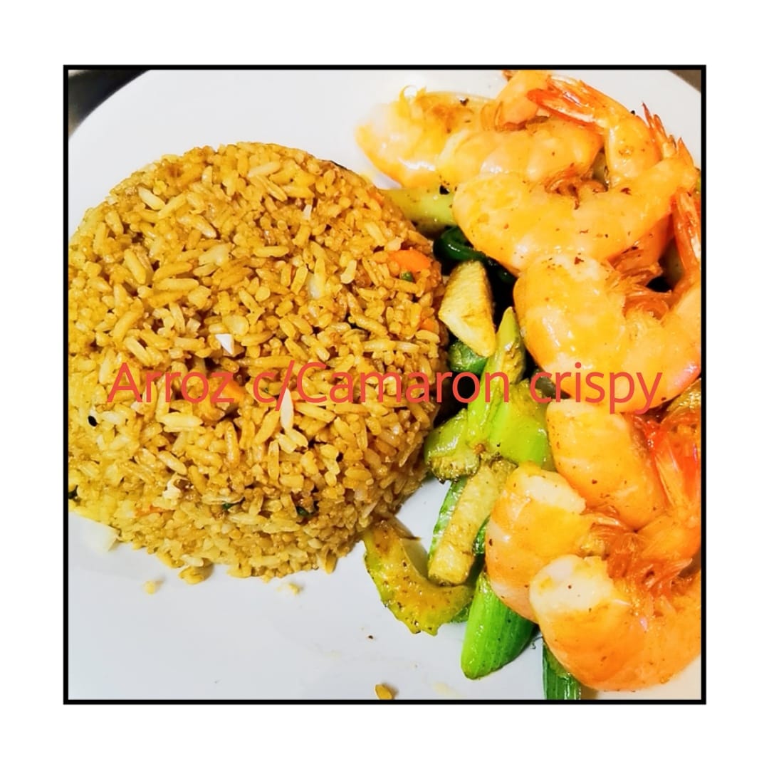 Arroz frito y/o spaghetti, un guisado a elegir y porción de camarón.( Camarón frito con cascara con apio, zanahoria, cebolla y jalapeño. 10 pzas por porción.