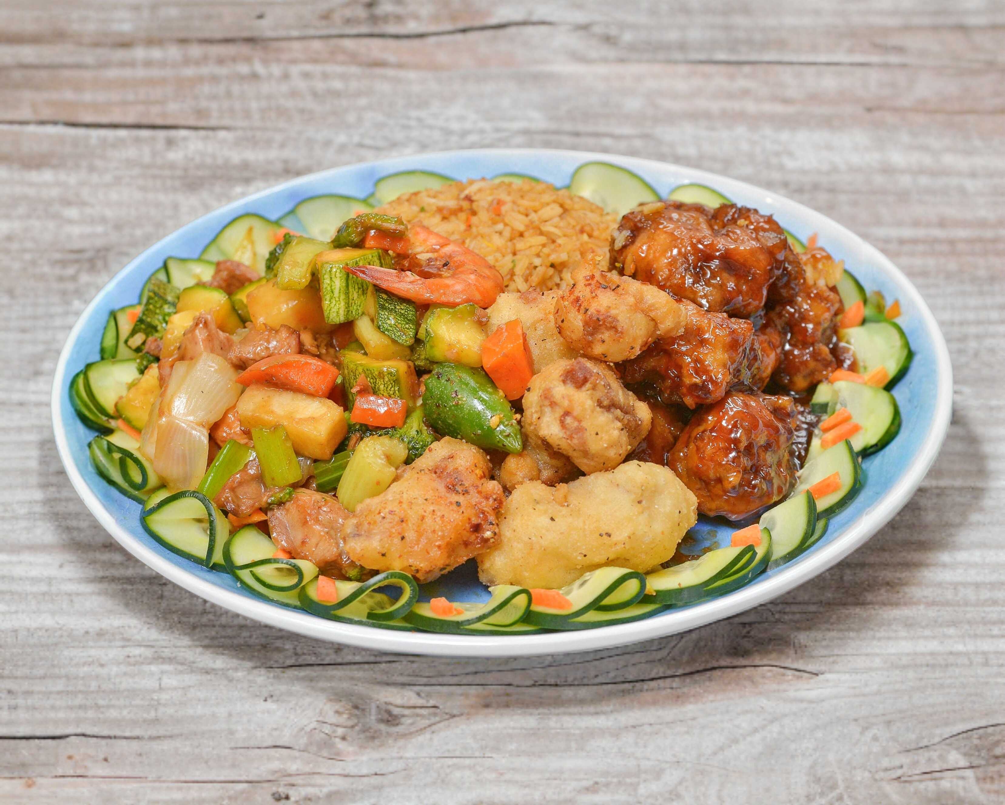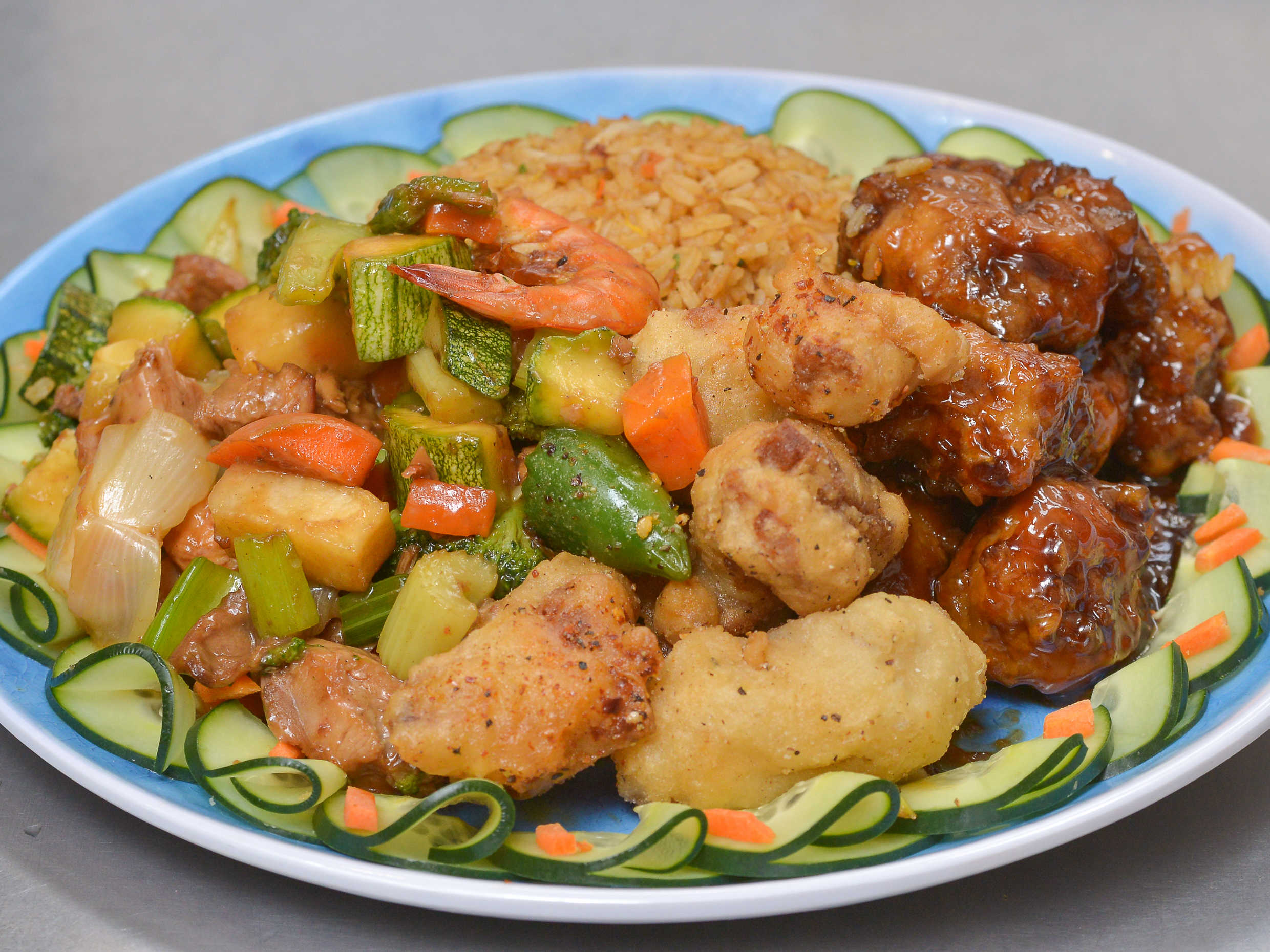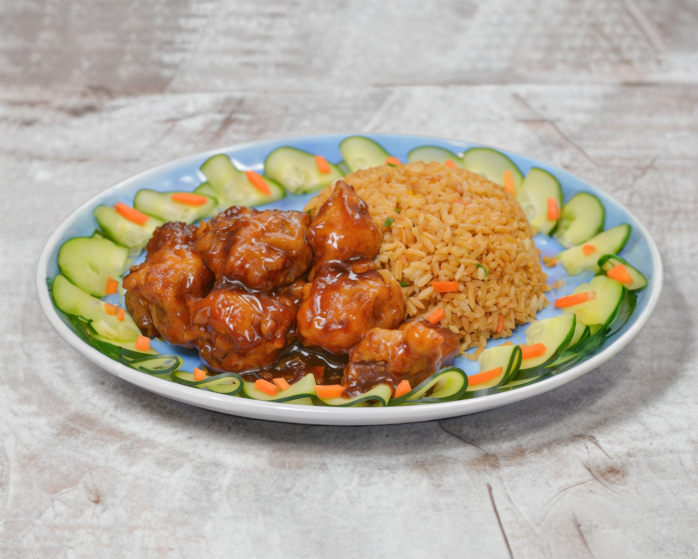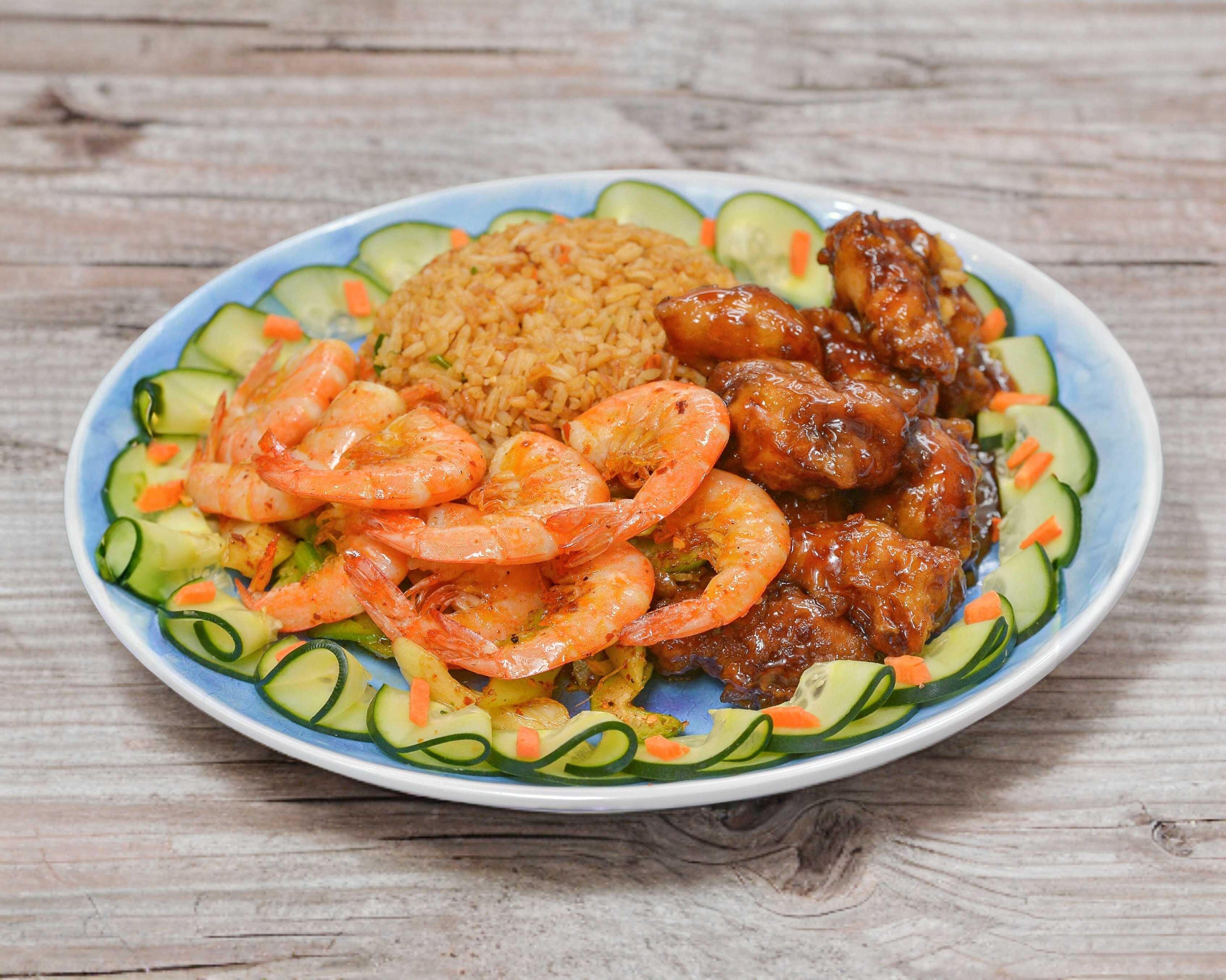Arroz frito y/o spaghetti, un guisado a elegir y porción de camarón.( Camarón frito con cascara con apio, zanahoria, cebolla y jalapeño. 10 pzas por porción.