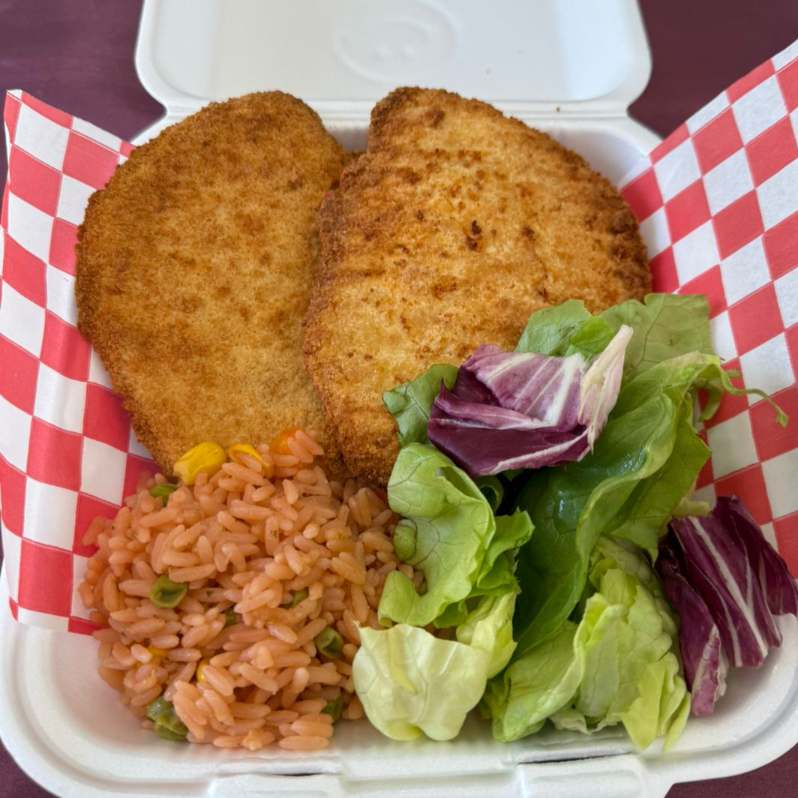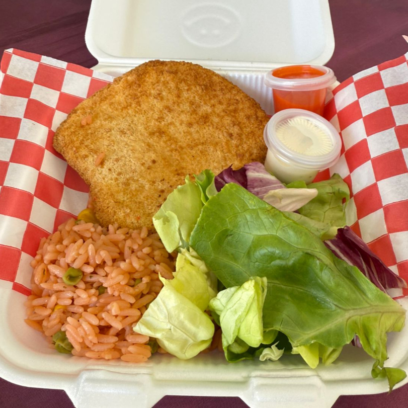MILANESA DE POLLO 2 PZ ARROZ Y ENSALADA
