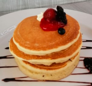 3 Hot cakes acompañados con fruta, miel y chocolate líquido.