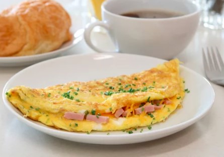 Omelette relleno de champiñones y espinaca, queso gratinado, acompañado con frijoles refrítos.