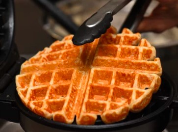 Waffle acompañados con fruta, endulzado con miel y chocolate.
