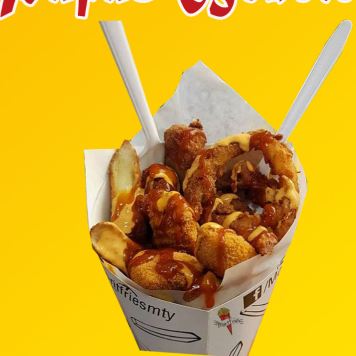 papas a la francesa con trocitos de boneles bañados en queso amarillo, aderezo ranch, salsa catssup, salsa bbq y mango habanero