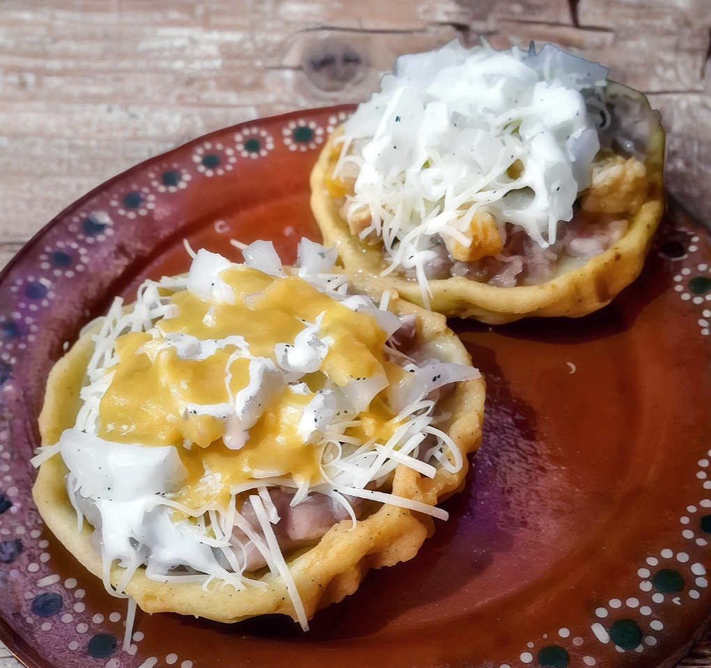 Sopes rellenos de un guiso a elegir, acompañados de lechuga, crema y queso.