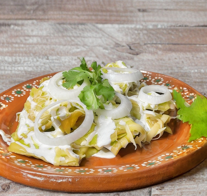 Chilaquiles verdes con queso y crema, acompañados de un guiso y frijoles