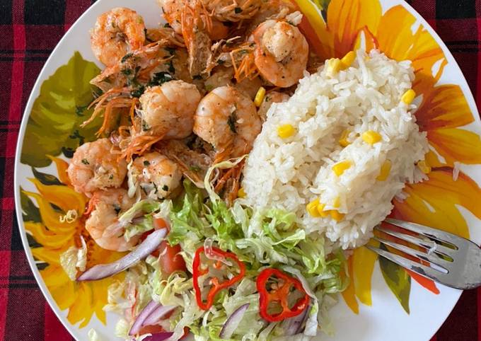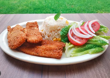 camarones empanizados acompañados con arroz y ensalada