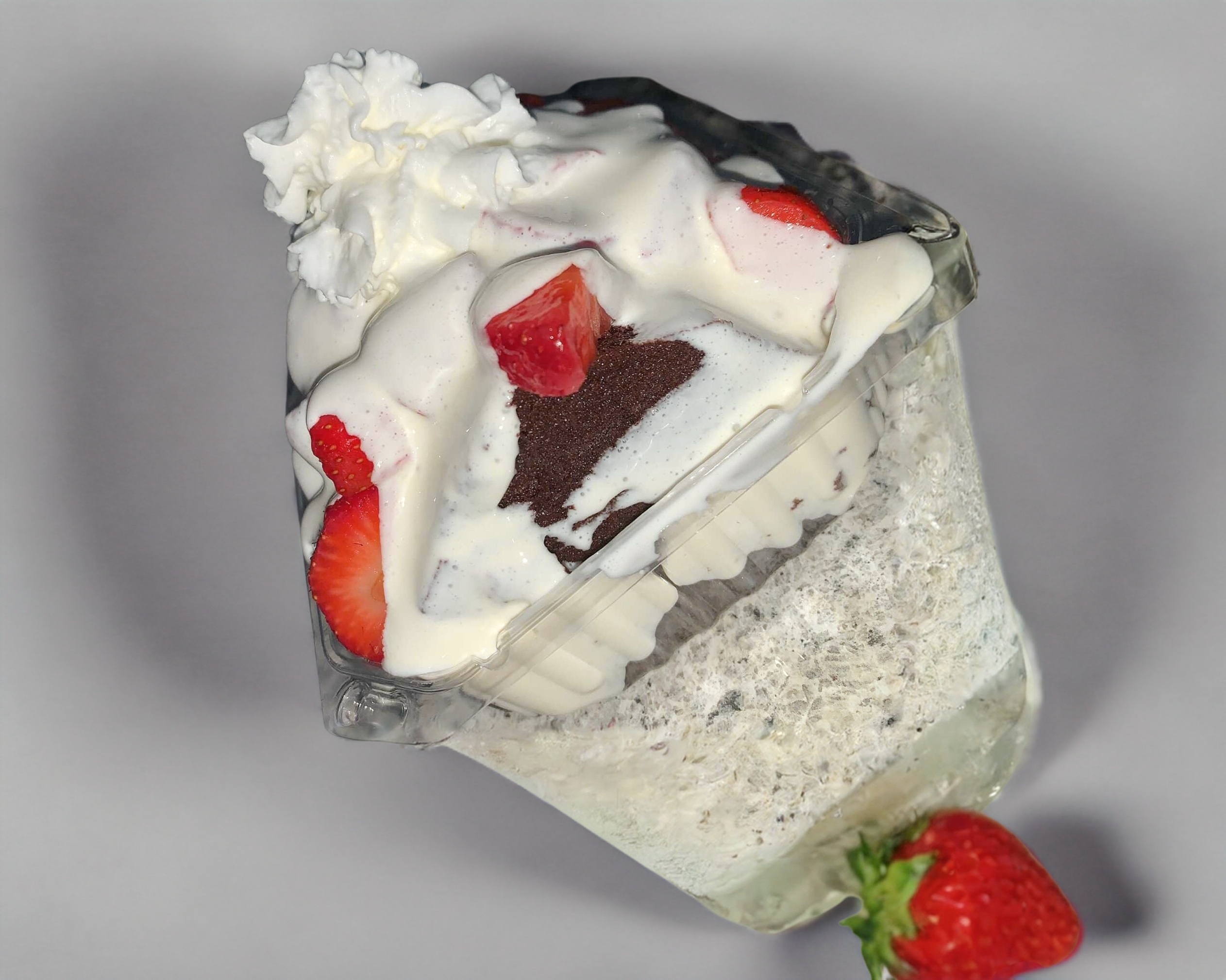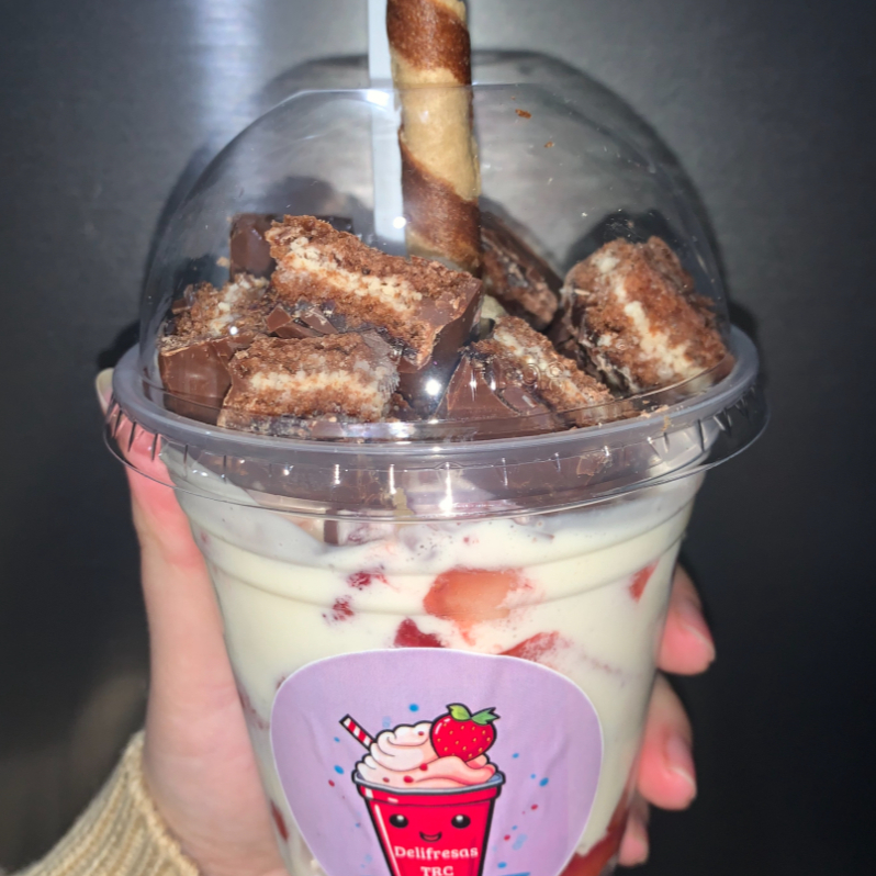 Vaso de 500 grs cubierto de hersheys jarabe + fresas con crema especial + pinguino + jarabe hersheys + chispas de chocolate + crema batida