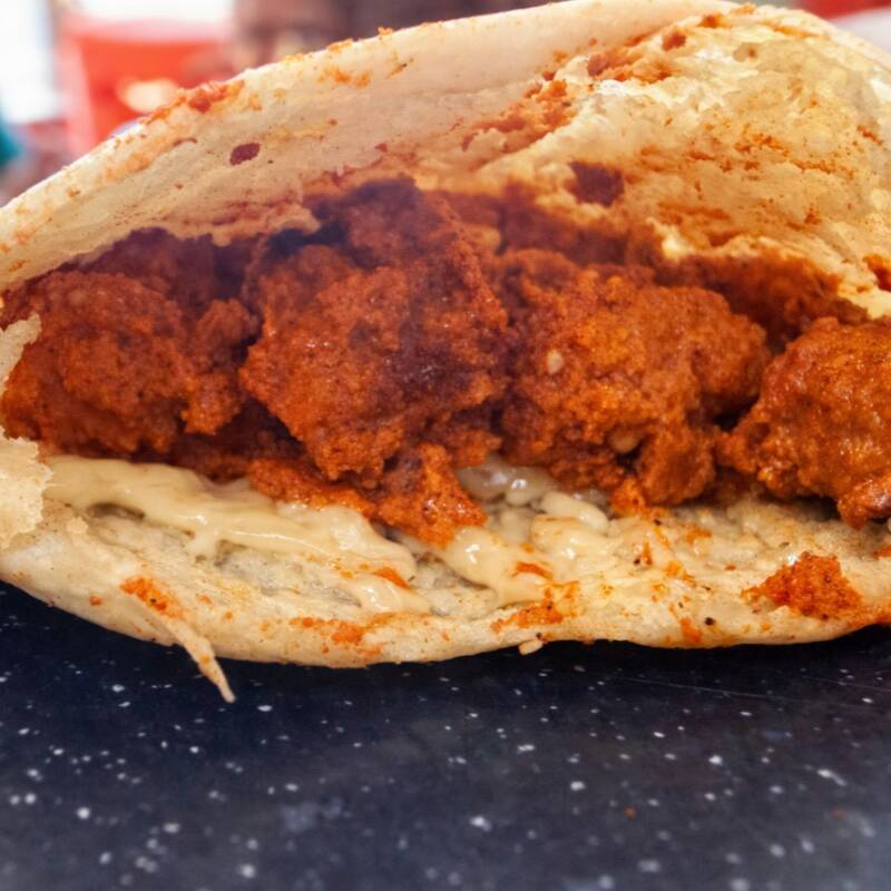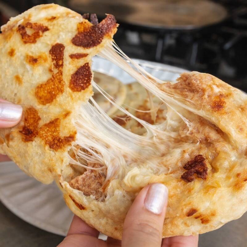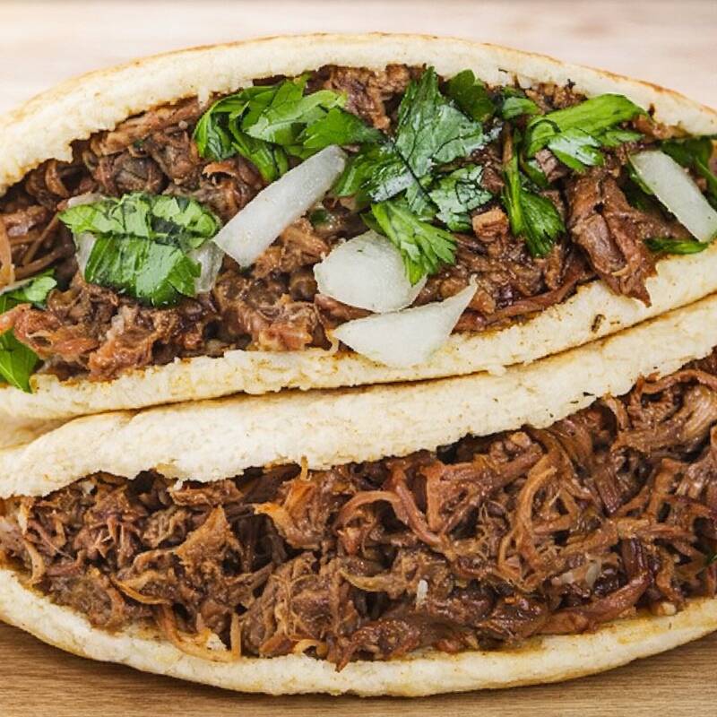 Gordita de arina acompañada de barbacoa de res, cilantro, cebolla y salsa casera