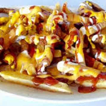 Papas a la francesa con aderezo ranch, queso chezzewhiz, salsa bbq, salsa mango habanero
