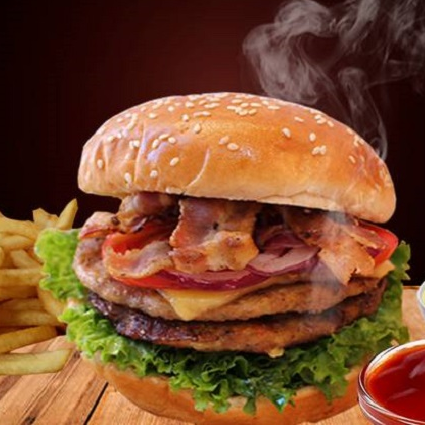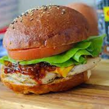 120 gr de pechuga de pollo bañada en bbq, jamón, queso, lechuga, cebolla, tomate, aguacate, aderezos