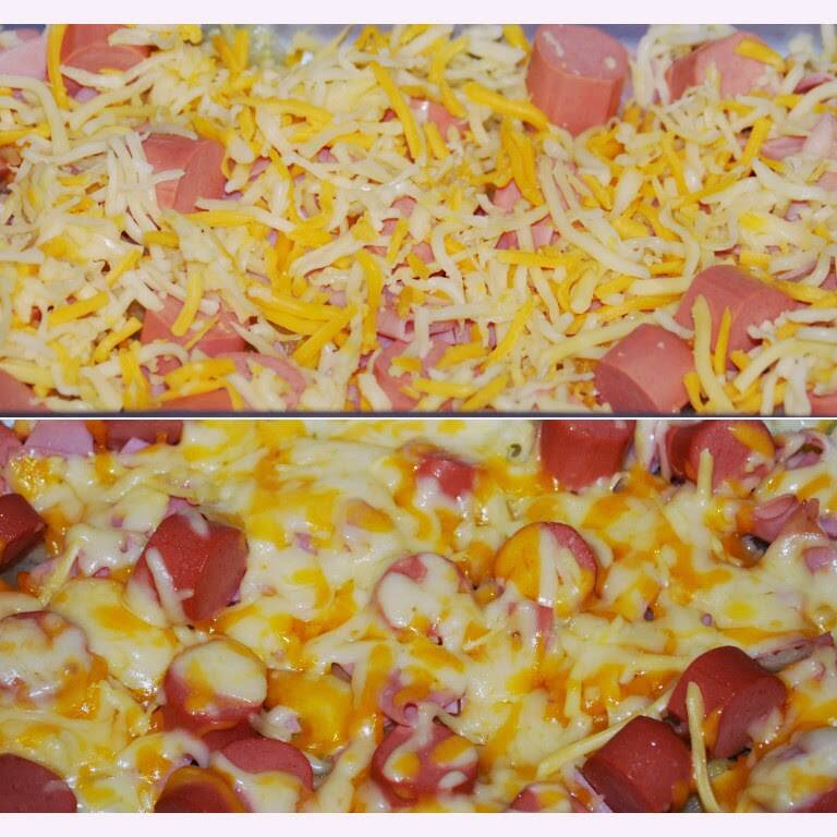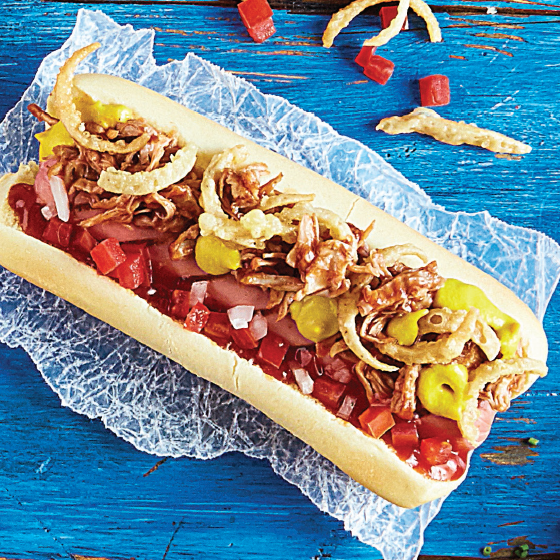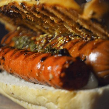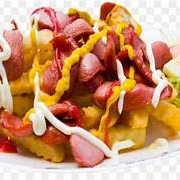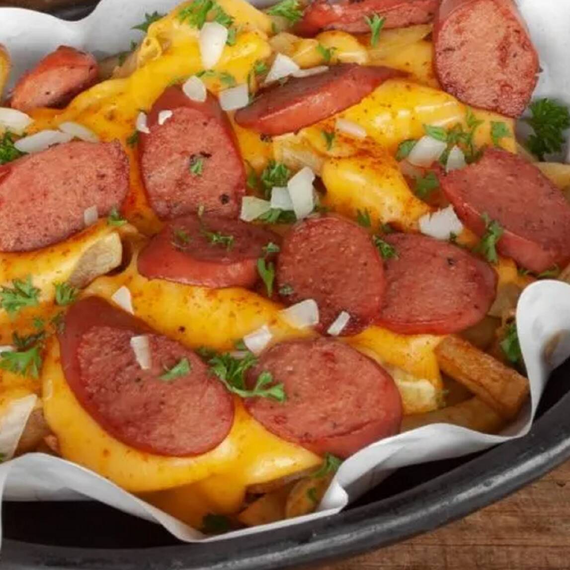 Salchicha de pavo y salchicha asada, guisada con tocino con chorizo y cebolla, bañada en BBQ, queso Cheez Whiz, tomate, aguacate, cátsup y queso chihuahua.