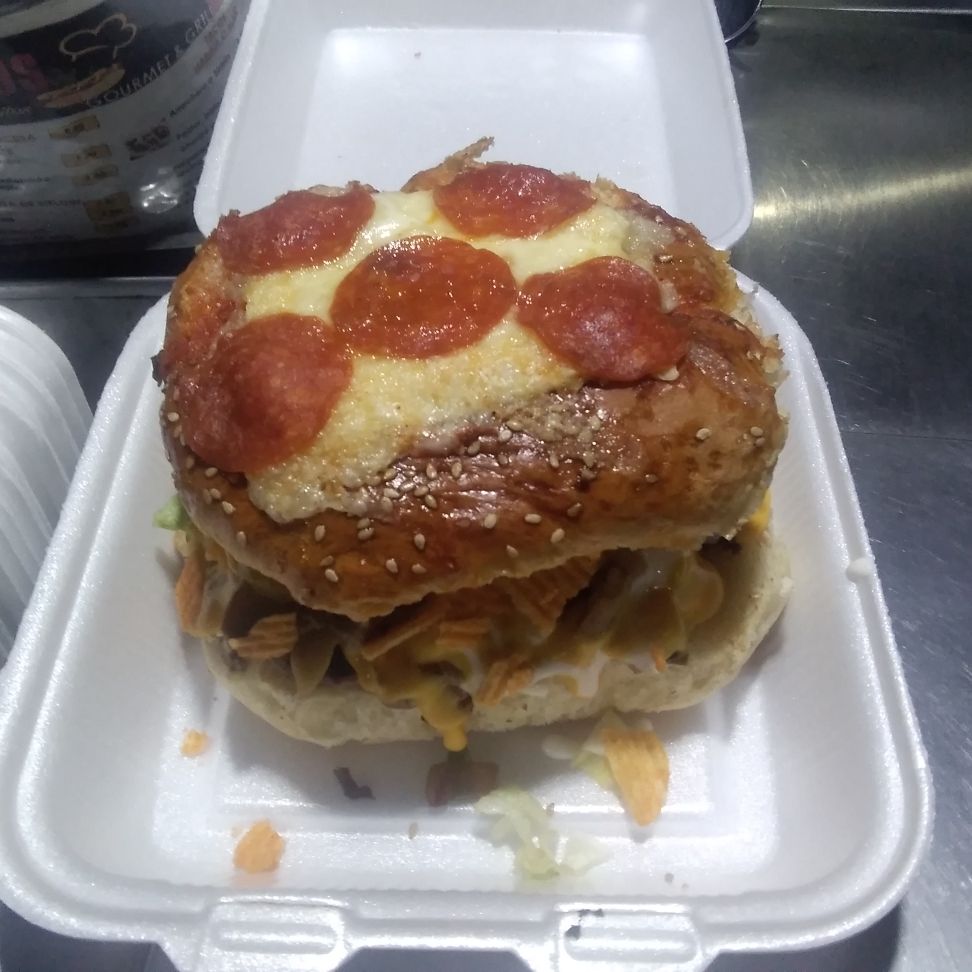 Salsa de tomate, pepperoni, chorizo, queso, queso Philadelphia y salchicha.