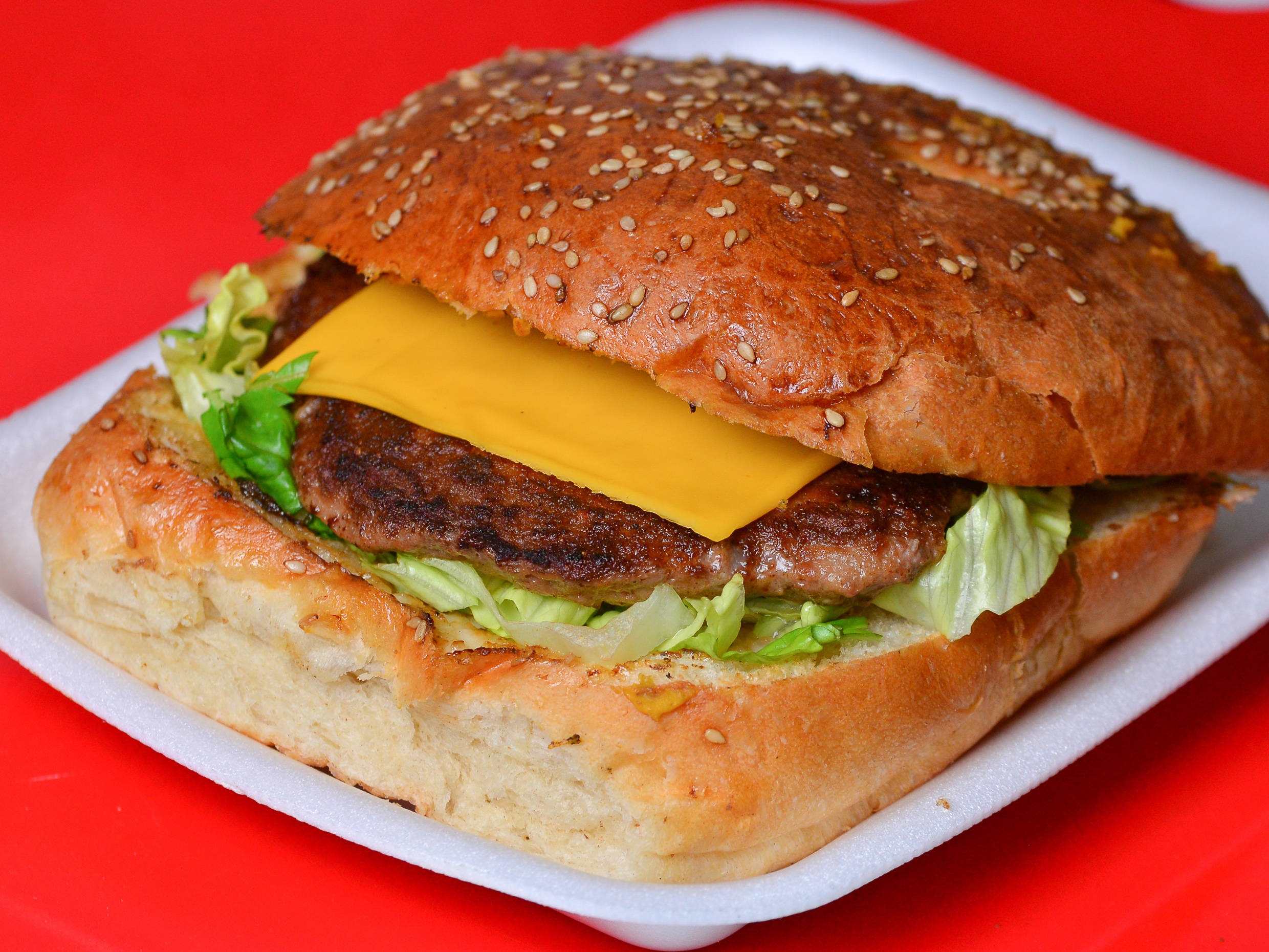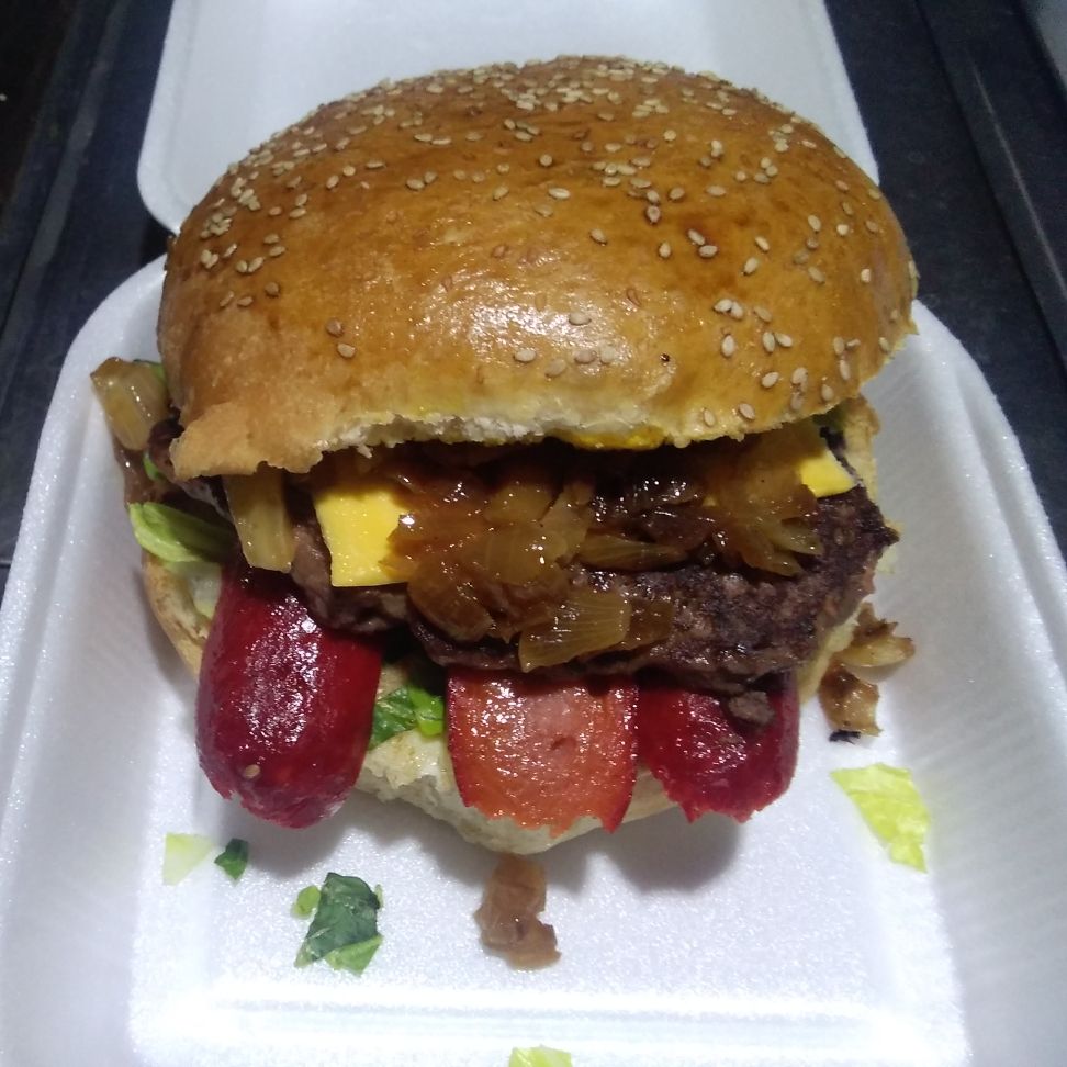 Carne de sirloin con queso amarillo, lechuga y salchicha.