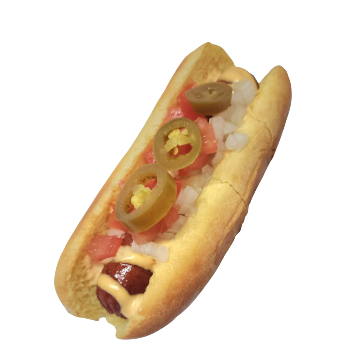 Salchicha de res, tomate, cebolla, chile y aderezos.