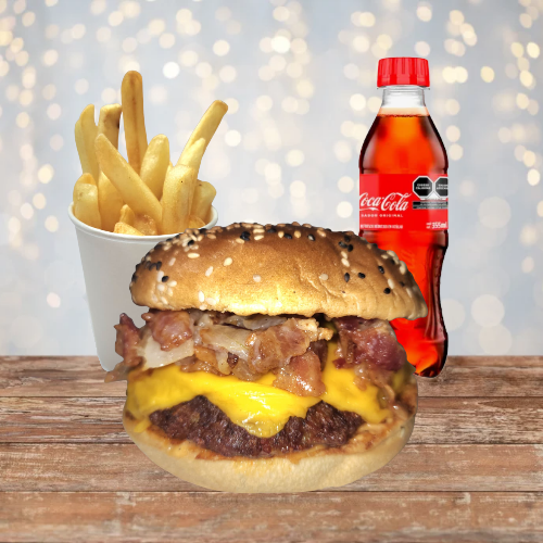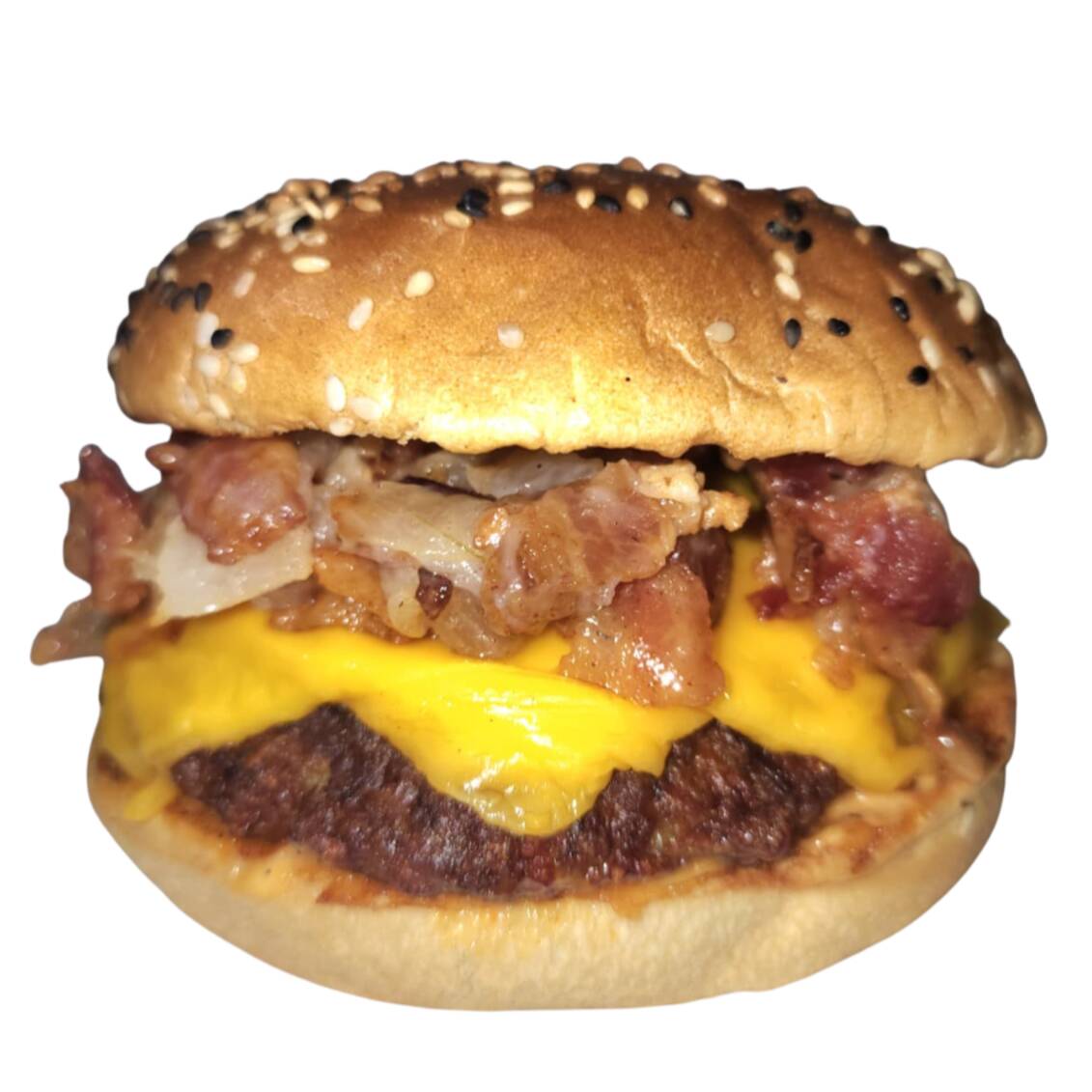Carne jugosa, doble queso americano, aderezo Don Rico y cebolla caramelizada con tocino.