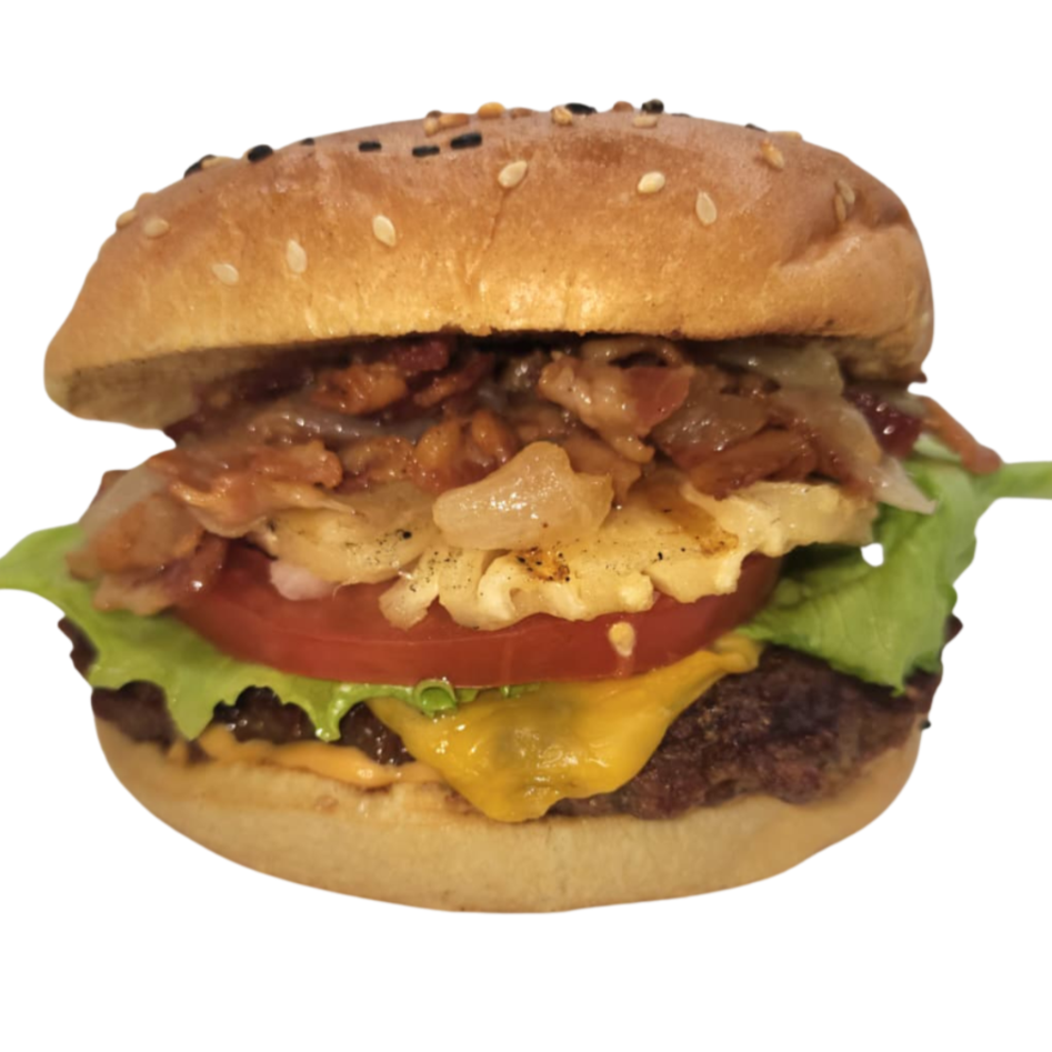 Carne jugosa, queso americano, aderezo Don Rico, piña, lechuga ,tomate y cebolla caramelizada con tocino.