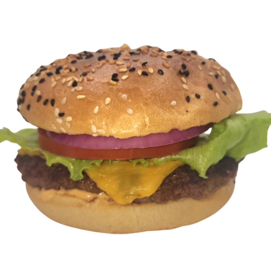 Carne jugosa ,queso americano, aderezo Don Rico, lechuga, cebolla morada y tomate.