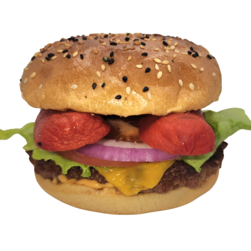 Carne jugosa, queso americano, aderezo Don Rico, lechuga, tomate, cebolla morada y salchicha para asar